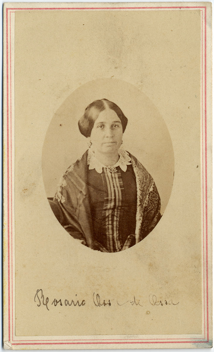 Retrato de forma ovalada de una mujer con pelo recogido y un vestido negro con rayas en el medio con chal.