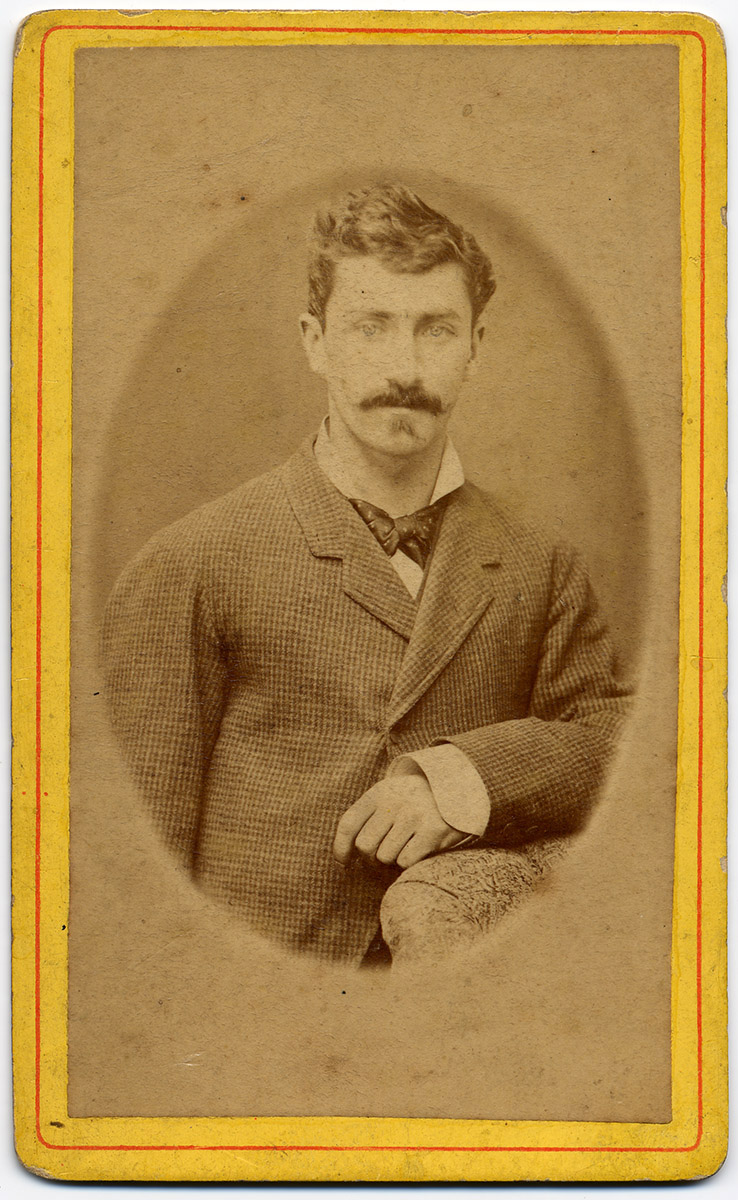 Retrato de busto de un hombre con bigote y barba, vestido con abrigo cerrado y sentado en un sillón.