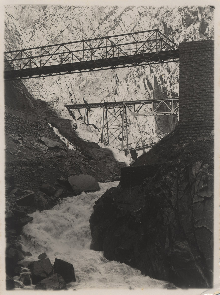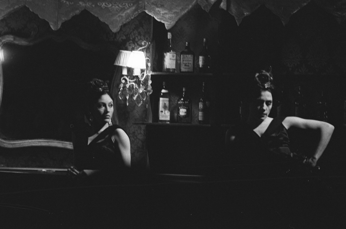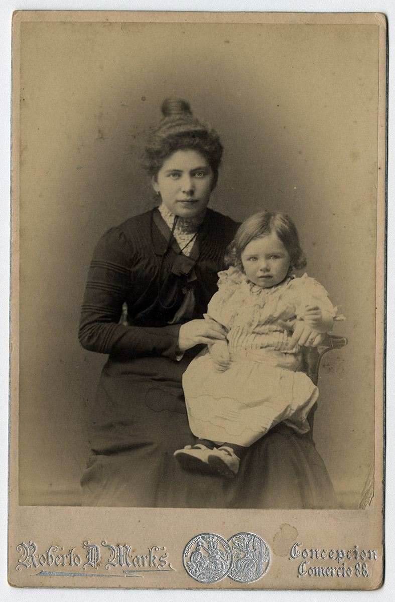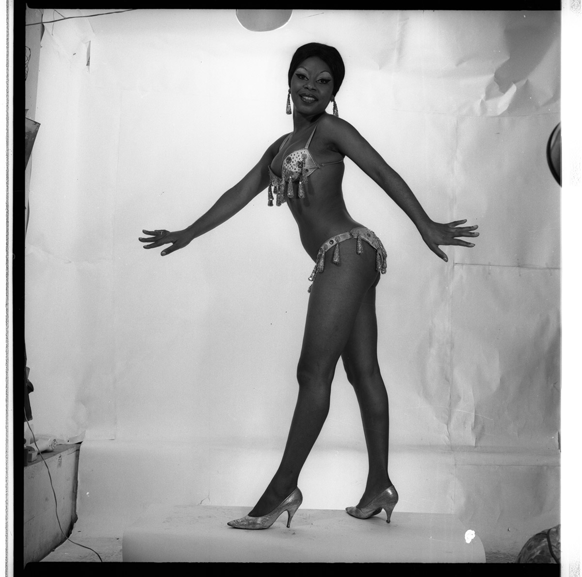 Retrato de una novia de pie con el velo extendido sobre el suelo. Lleva un ramo de rosas blancas en las manos. Está rodeada por ramos de flores en floreros sobre tres alturas.