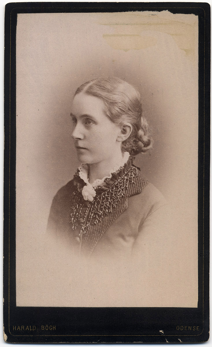Retrato de busto y de perfil de una mujer con pelo recogido y vestido negro.