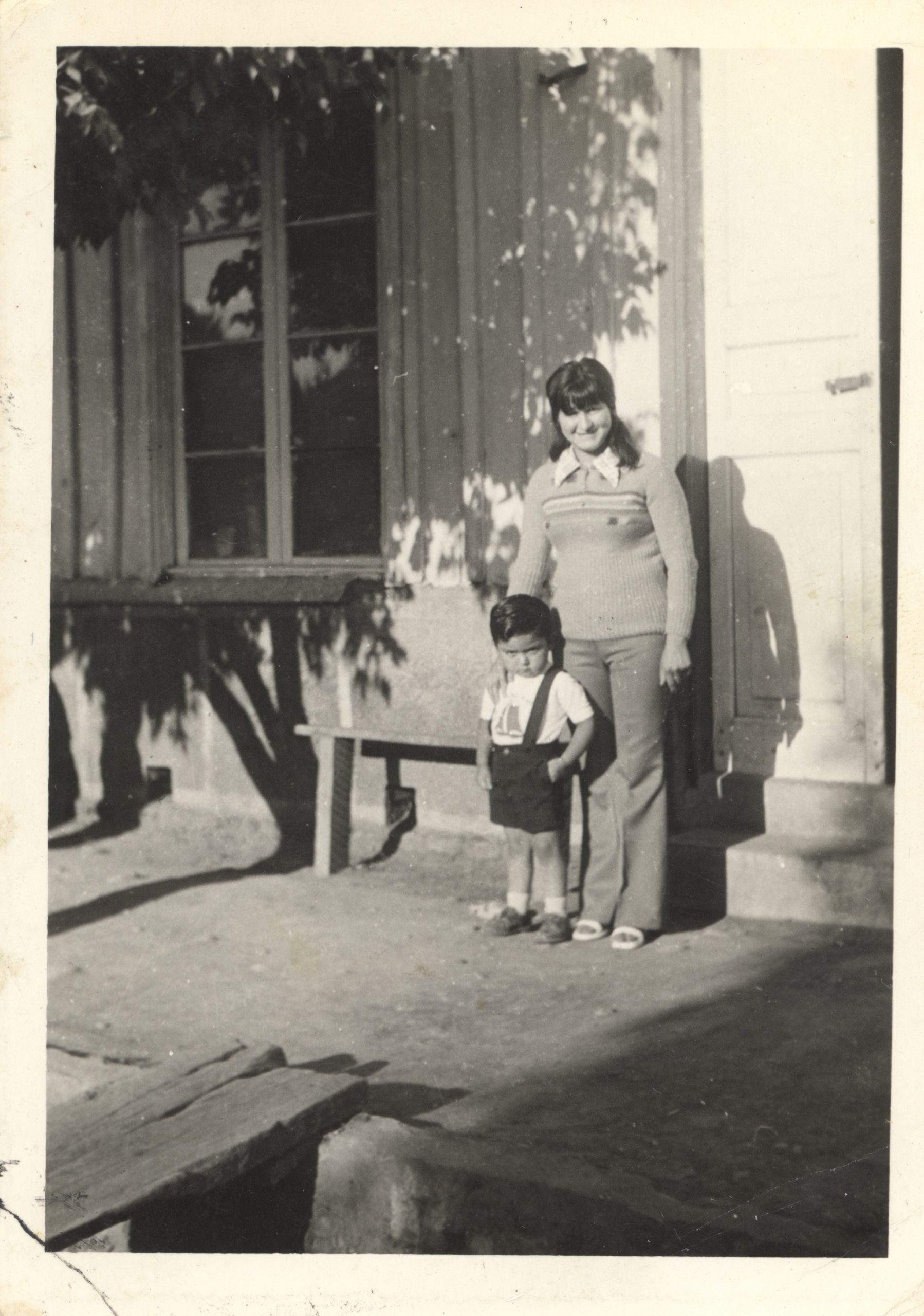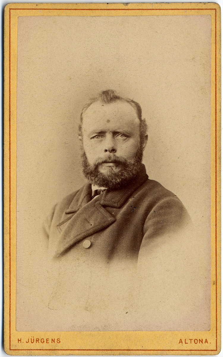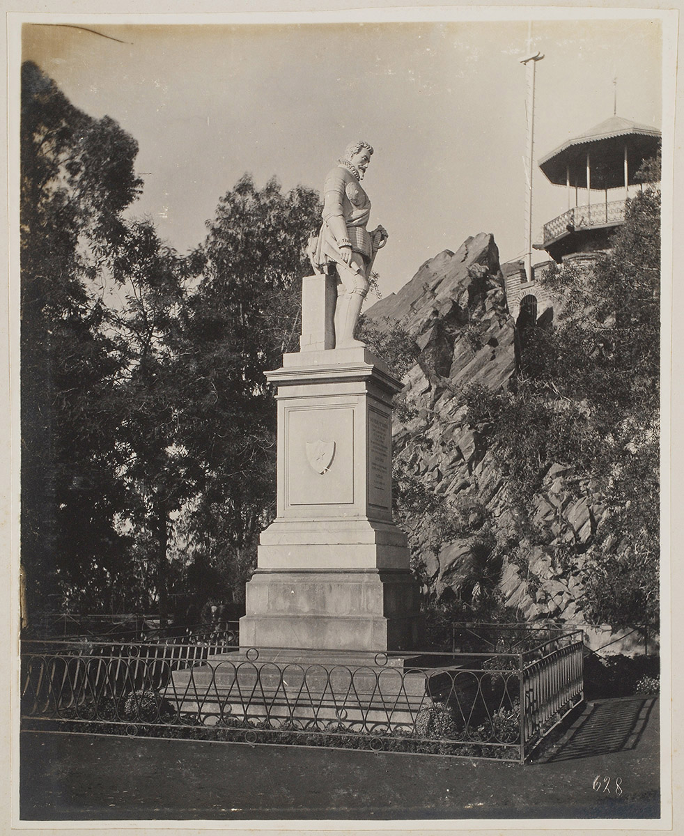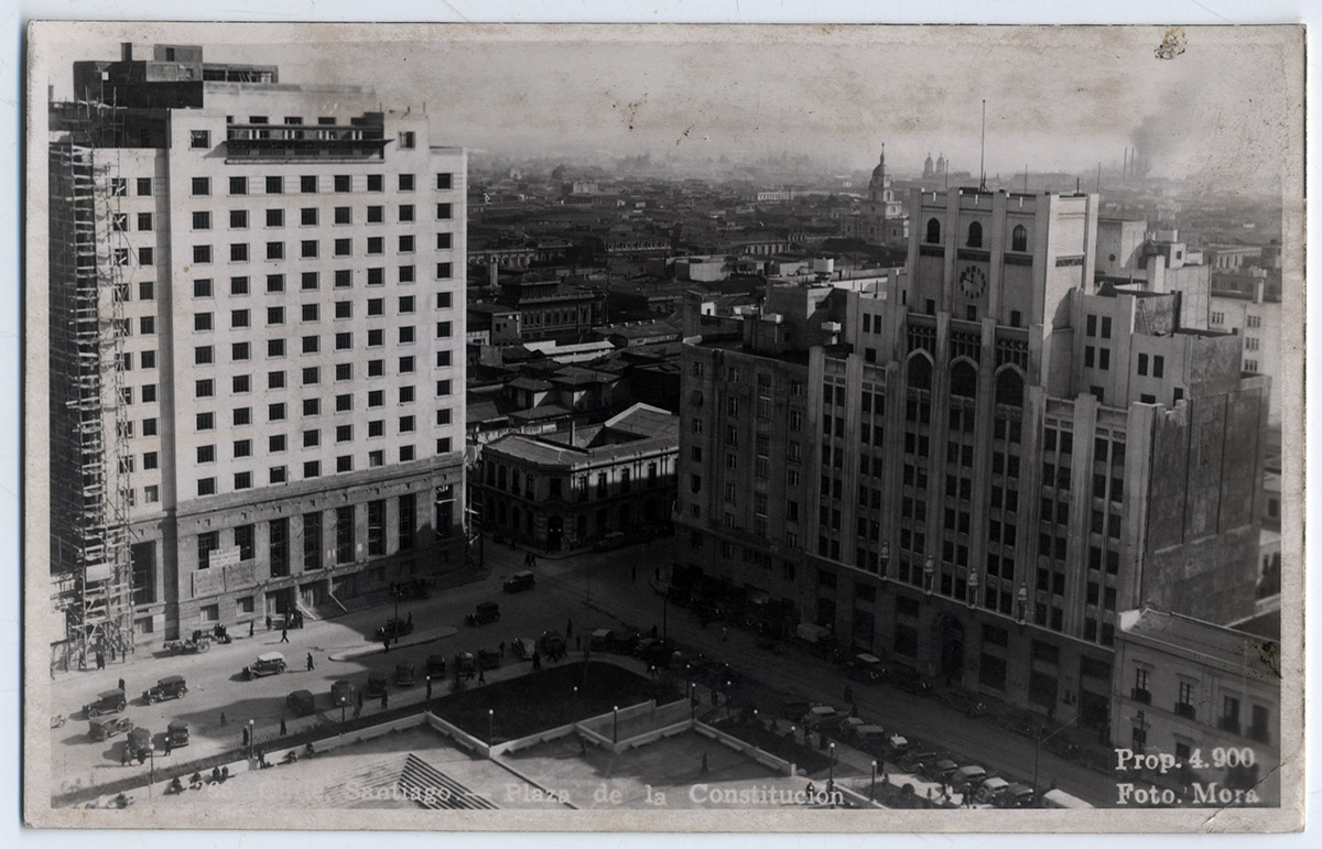 Retrato de tres hombres, uno sentado y los otros parados en un estudio, quienes tienen una de sus manos apoyada sobre el hombro del hombre sentado.