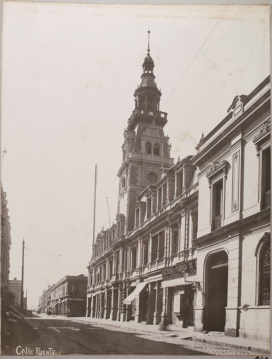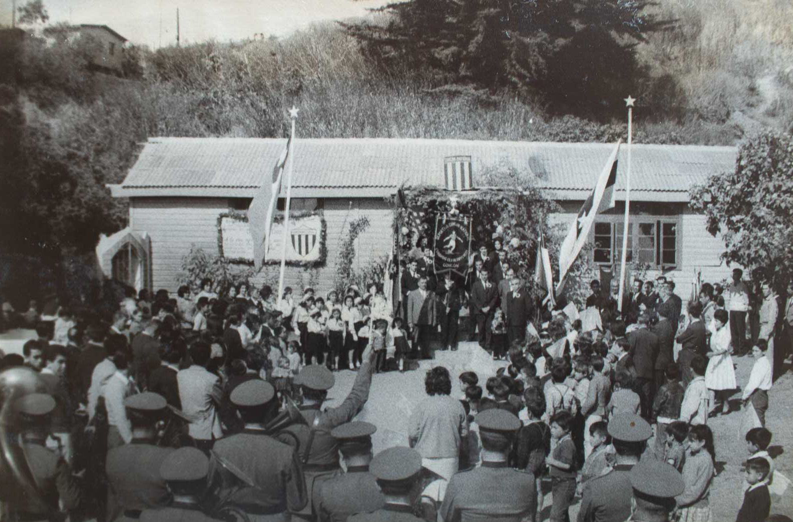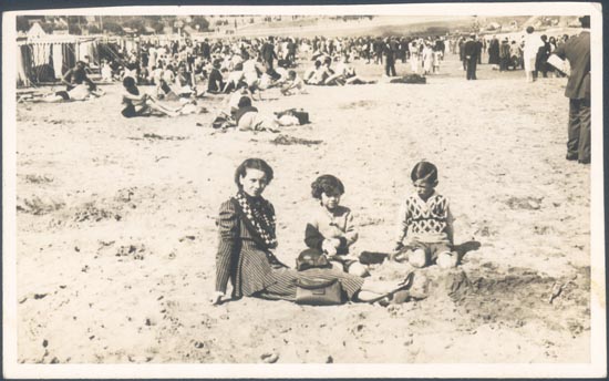Retrato de tres mujeres sentadas en la entrada de una vivienda.