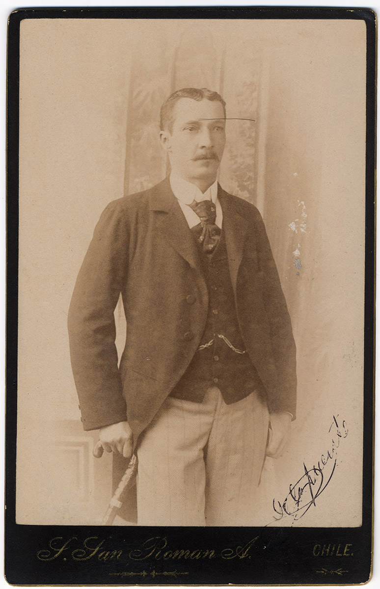 Retrato de busto de un hombre de bigote. Está vestido con frac negro y camisa blanca.