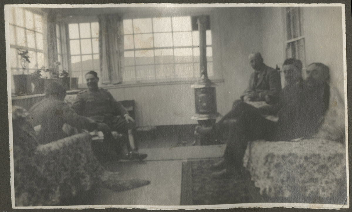 Retrato de un militar con uniforme. Lleva una espada a su lado y un gorro en la mano. Su brazo está apoyado sobre una silla. Tiene tres medallas sobre el pecho y un collar con otra.