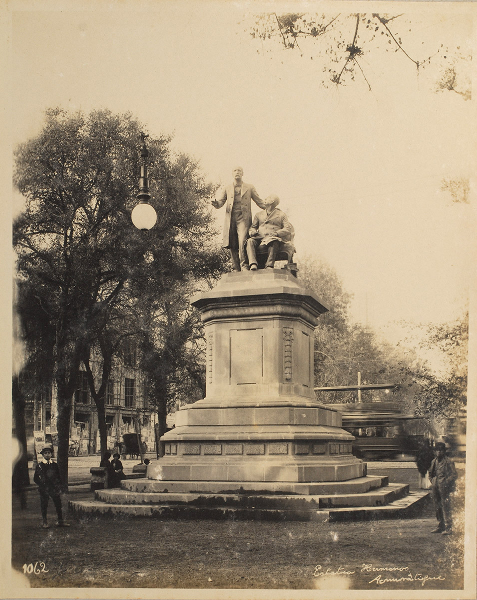 Retrato de pie de un niño con traje negro, botas y sombrero en la mano. Apoya un brazo sobre una mesa con mantel y cruza los pies.