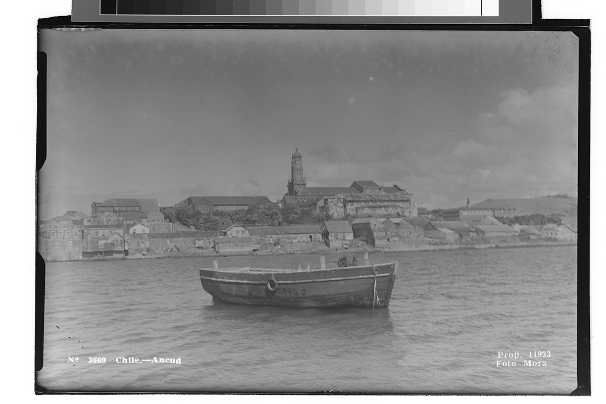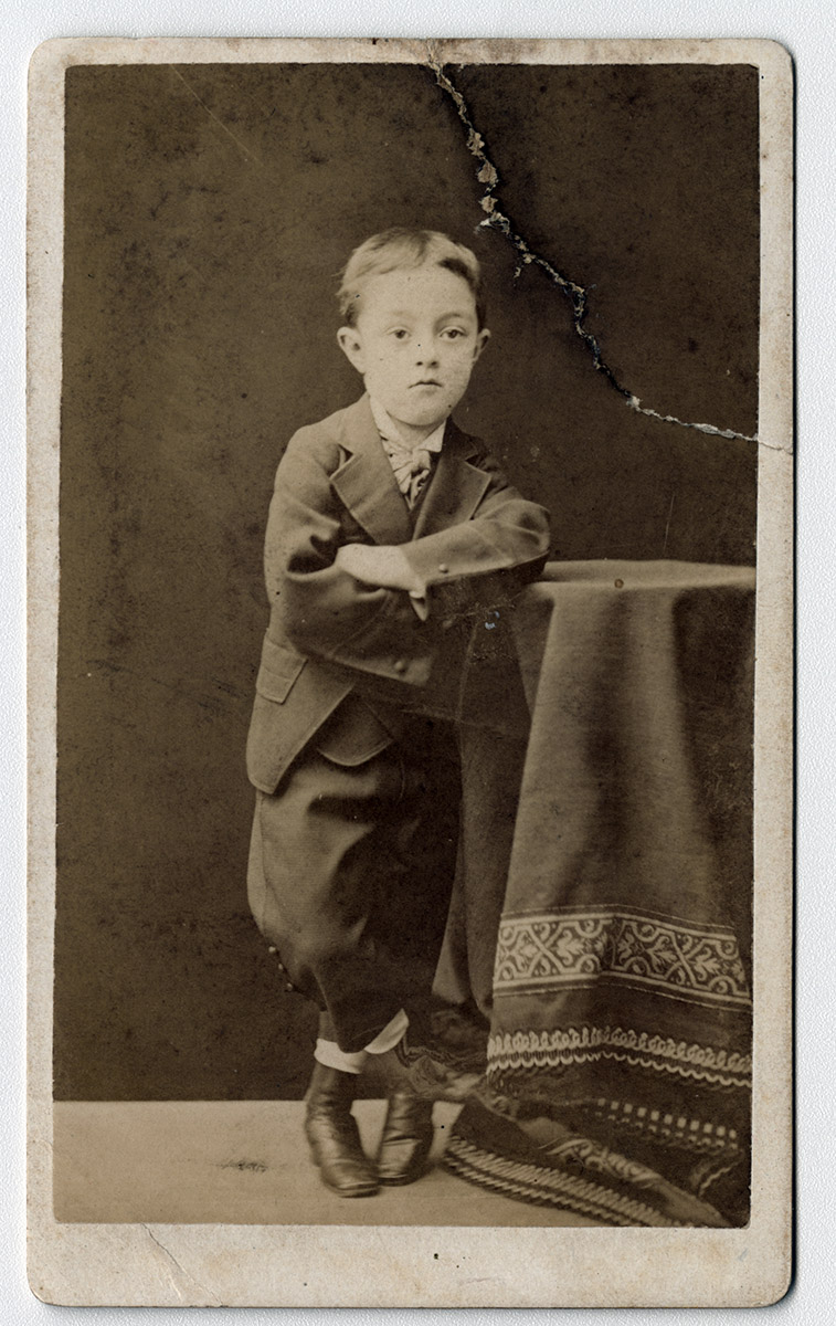 Retrato de pie de un niño con traje blanco, apoya sus manos sobre una mesa de madera.