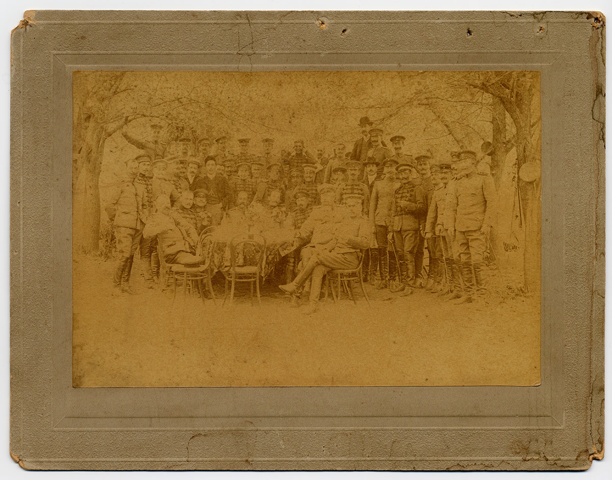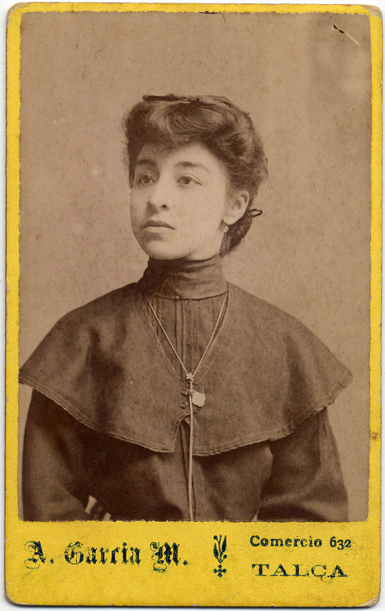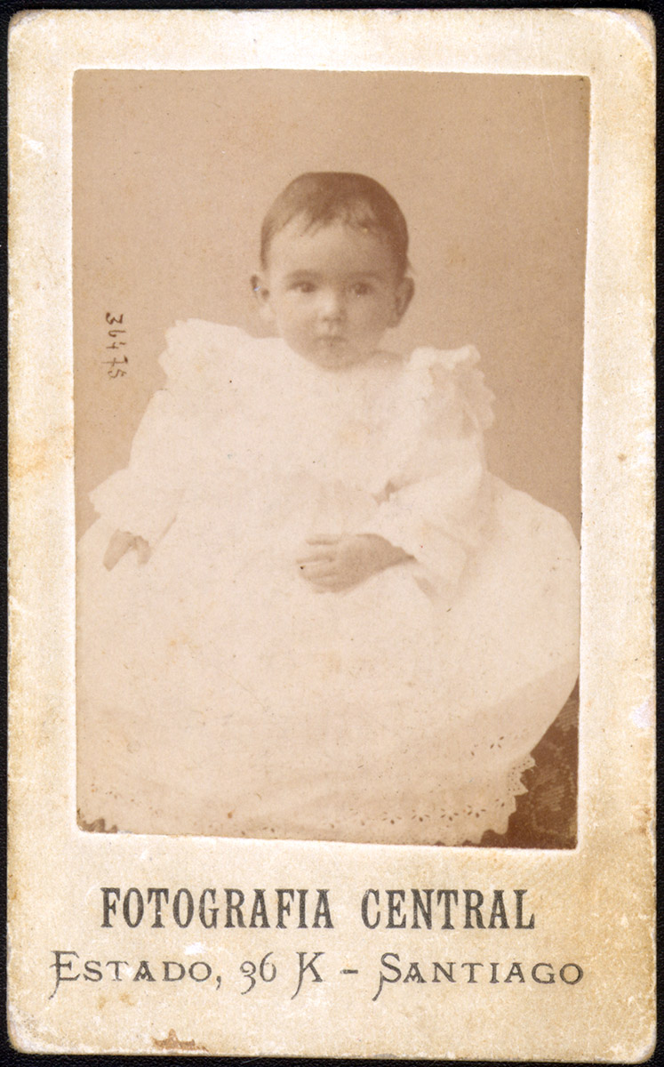 Retrato de unos padres con su hija de pie sobre una silla y apoyada sobre su madre.