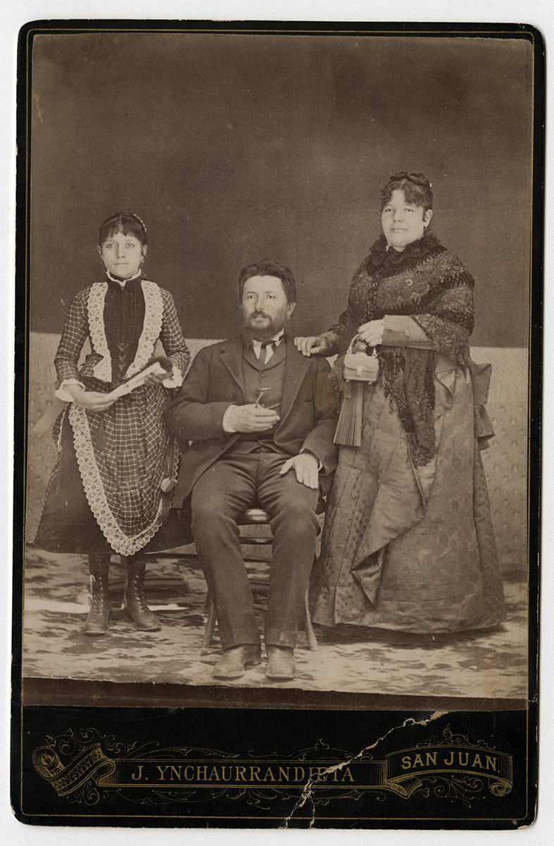 Retrato de una familia. El padre, con terno negro, está sentado sobre una silla. A su izquierda, su mujer está parada con vestido negro. Tiene una mano apoyada sobre el hombro de su esposo y en la otra lleva un abanico y un cartera chica. Al lado derecho