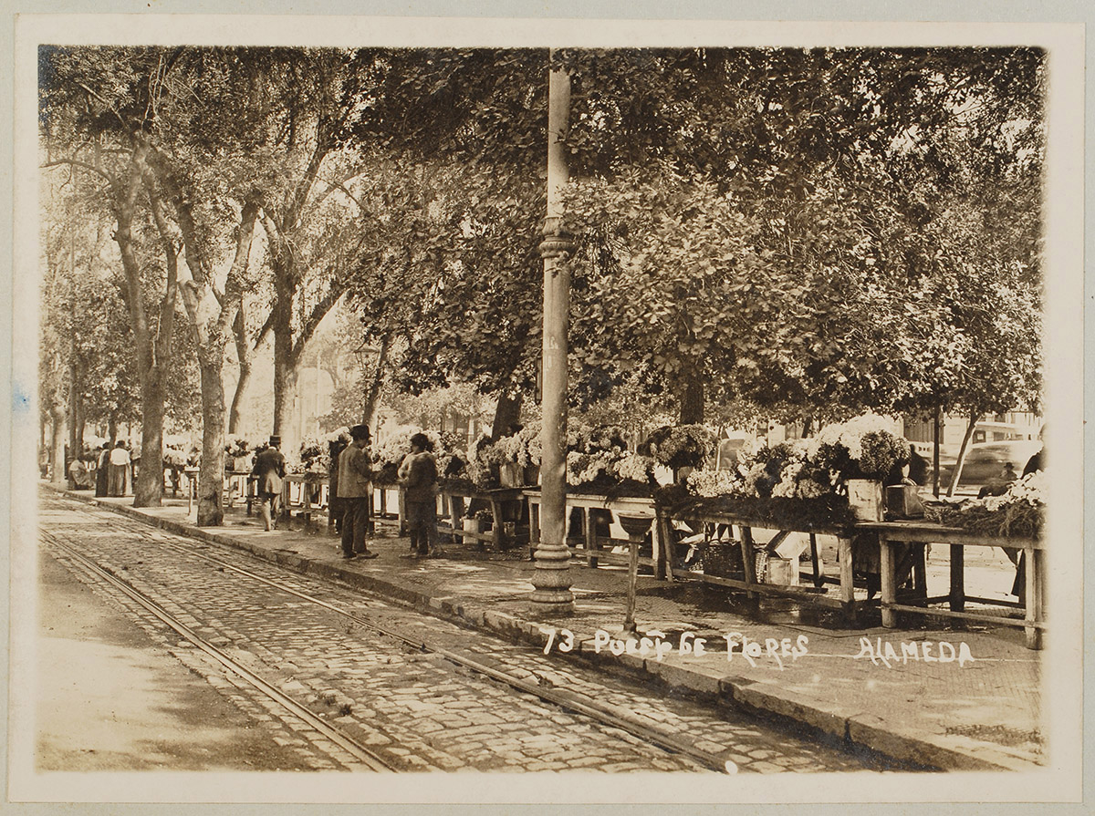 Retrato de pie de una mujer que usa un traje compuesto de una blusa blanca, falda, botas y sombrero redondo. Lleva aros y anillos.