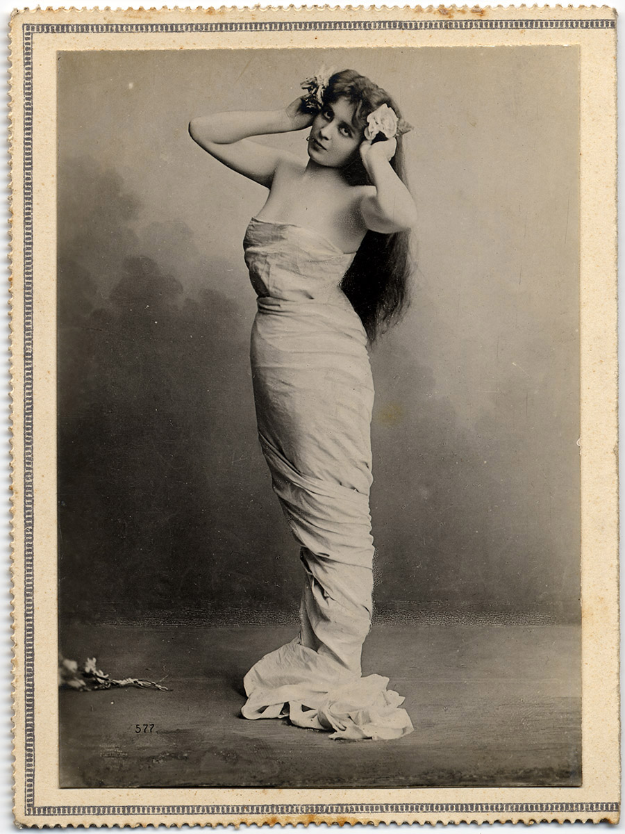 Retrato de pie de una mujer con pelo recogido y vestido negro. Está sentada sobre una silla y apoya un brazo sobre una mesa. Lleva un libro abierto sobre sus rodillas.
