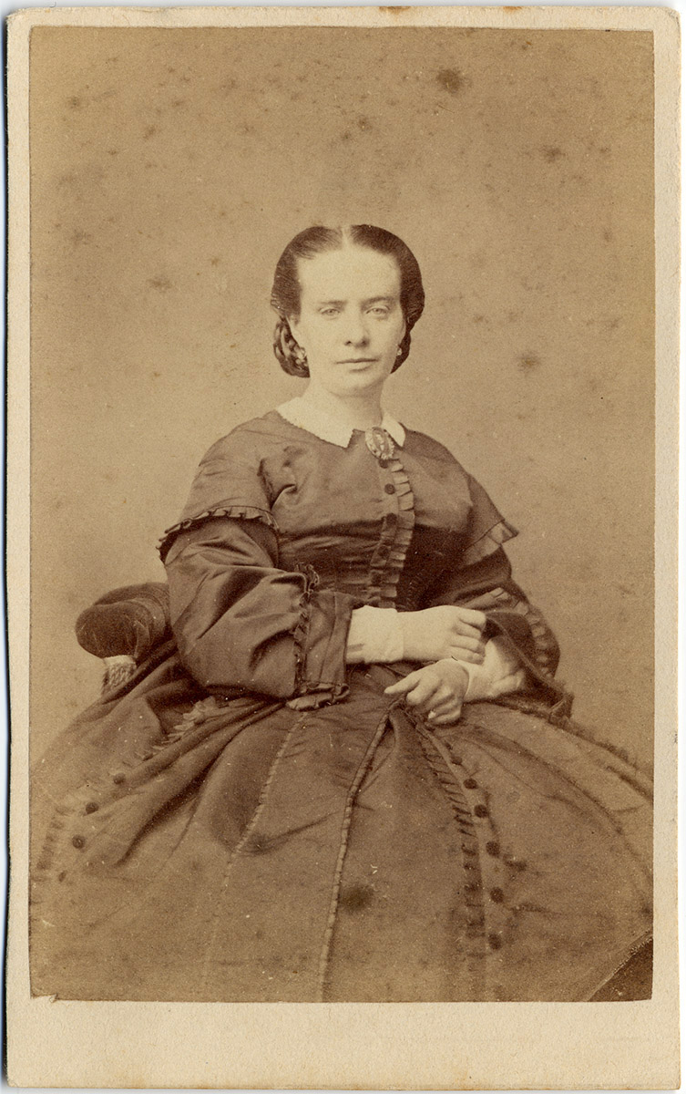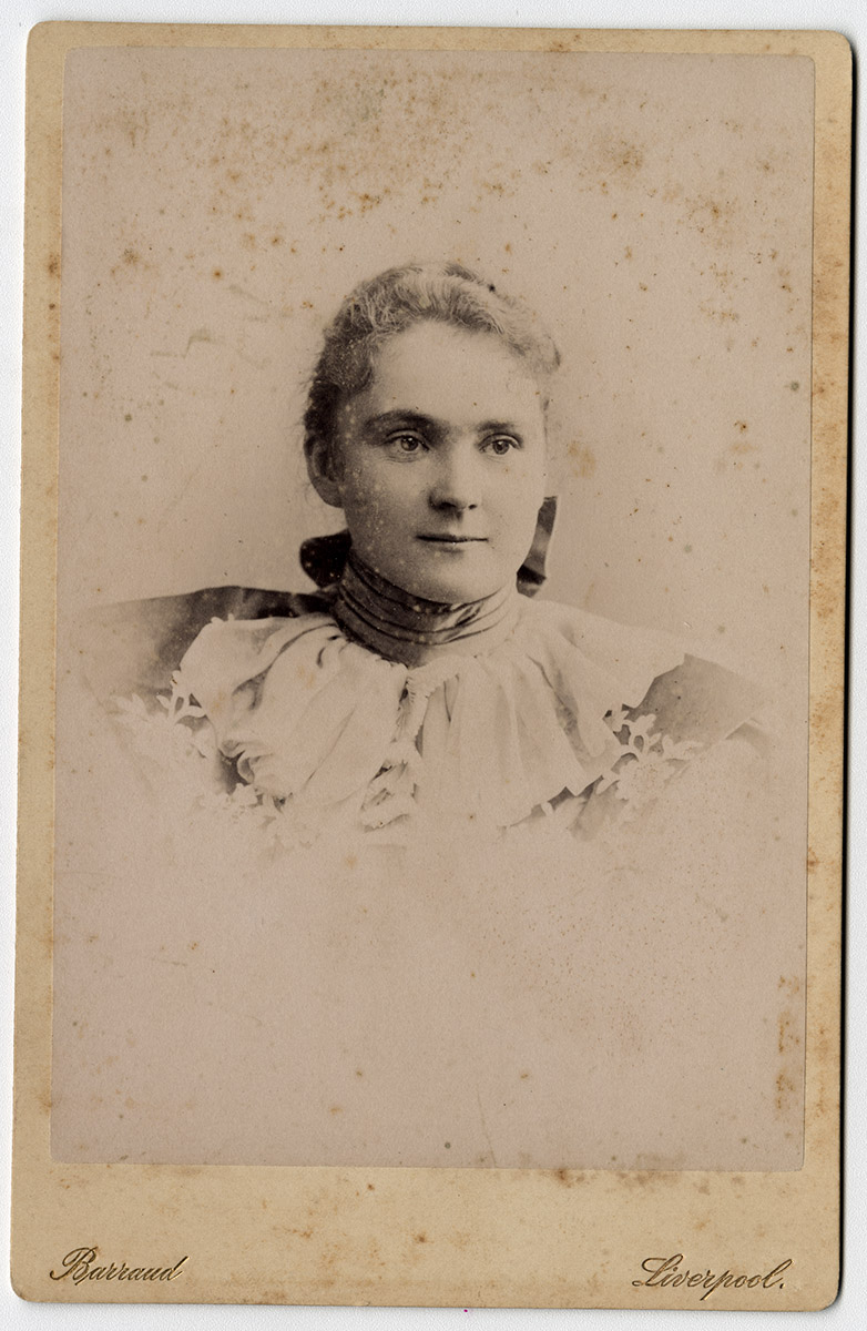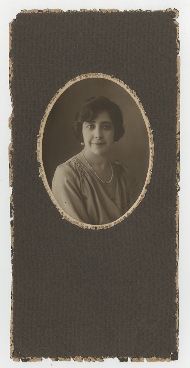 Retrato circular de mujer de pelo corto, aros y collar de perlas.