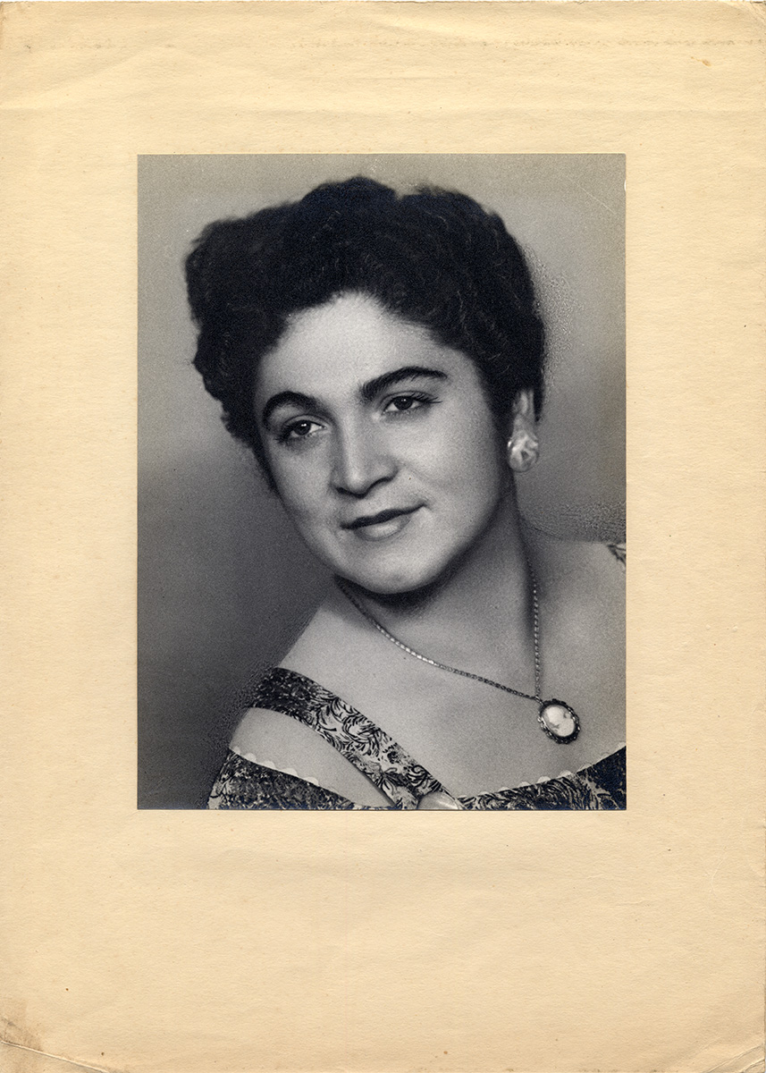Retrato en primer plano de una mujer con el pelo corto, vestido, collar con medalla y aros. Tiene el cuerpo levemente inclinado y mira hacia el costado.
