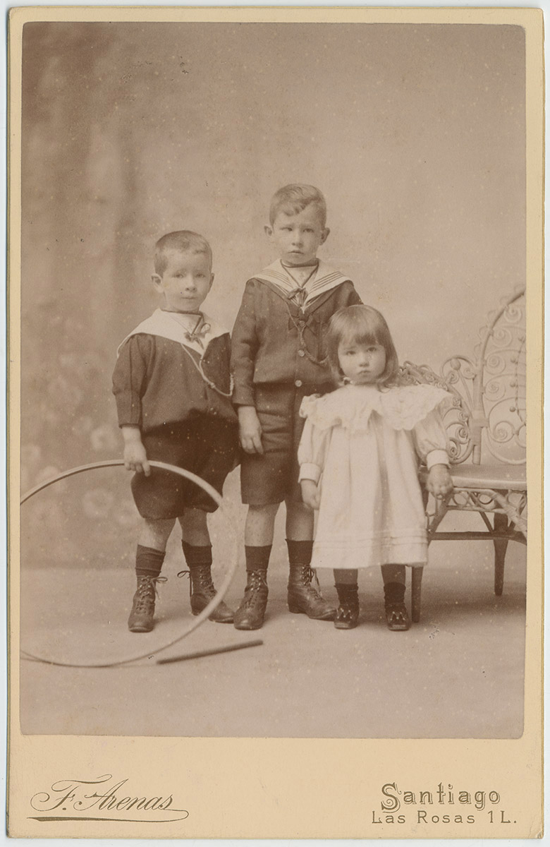 Retrato de pie y de forma ovalada de una niña con pelo corto y vestido blanco corto.