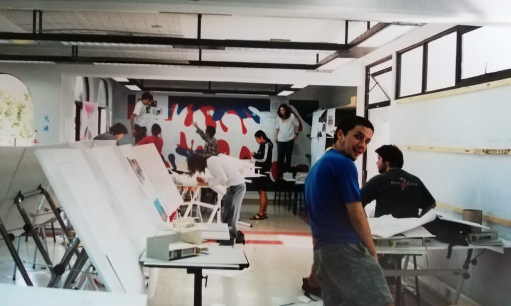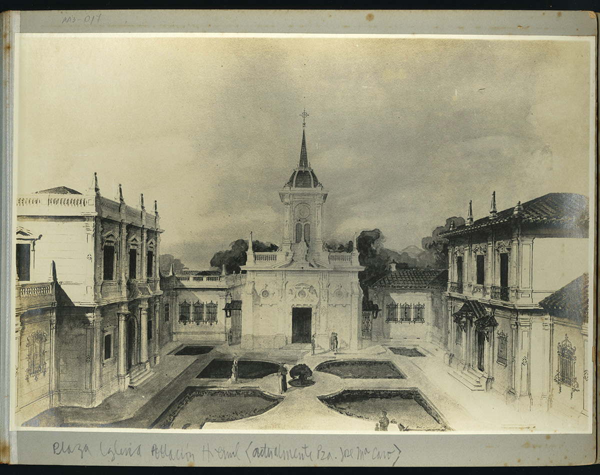 Retrato de pie de una niña con vestido corto y una gran cinta blanca en el pelo. Apoya sus manos sobre un banco.