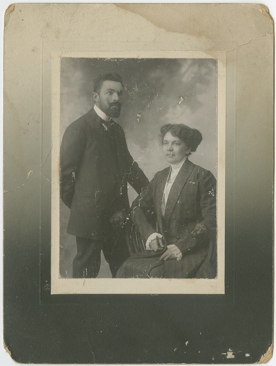 Retrato de una pareja. Ella, con blusa blanca y abrigo negro, se encuentra sentada. Él, con bigote y terno negro, está parado a su lado, apoyando una mano sobre el respaldo de la silla y la otra en su espada.