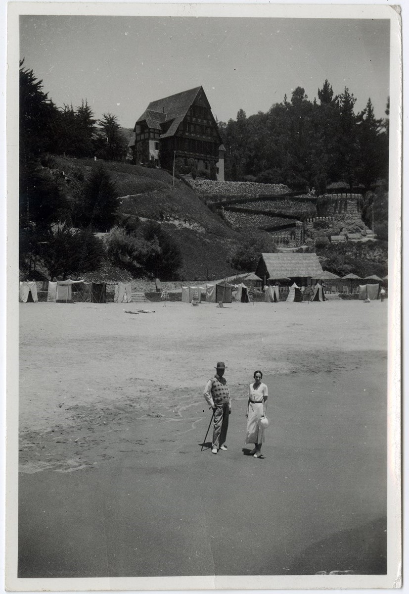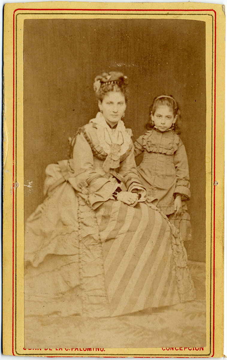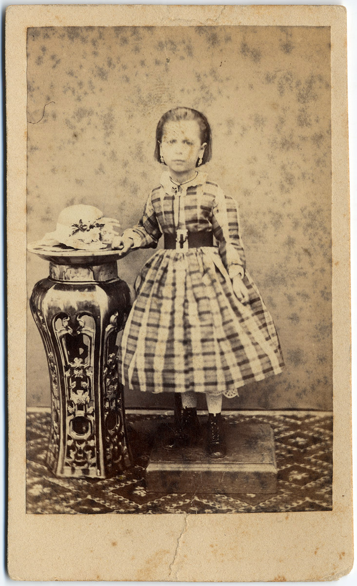 Retrato de un niño sentada sobre piedras. Lleva un vestido color claro, con calcetines y zapatos. Ocupa sombrero.