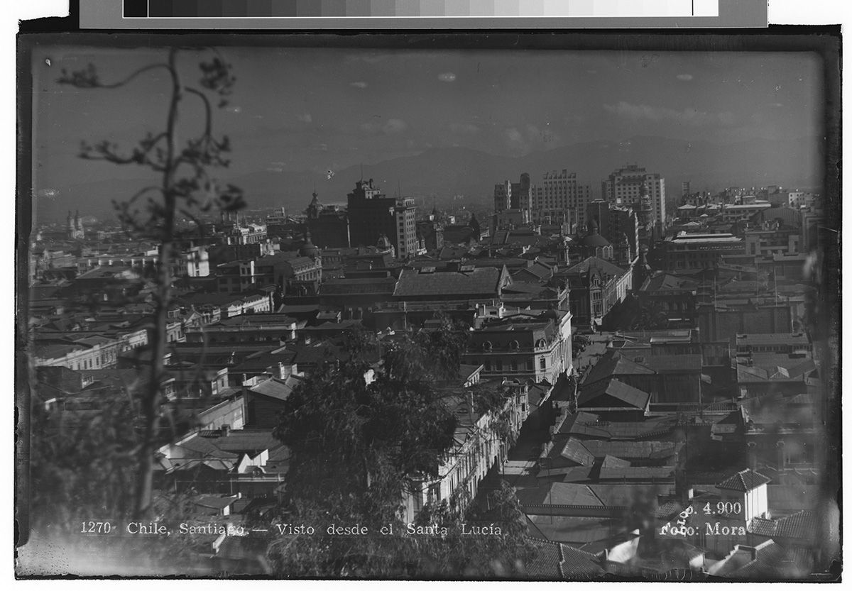 Vista de una ciudad desde los altos de un cerro. En primer plano se ve una plaza y después un edificio con patios interiores.