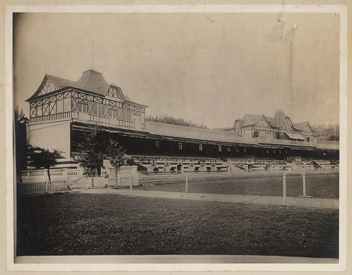 Vista de una casa colonial de dos pisos con una puerta de madera y balcones de fierro en el segundo piso.