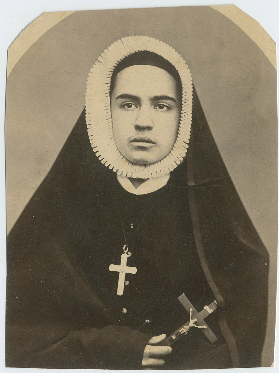Primer plano de un soldado que lleva puesto un sombrero, una chaqueta blanca, un cinturón negro y unos pantalones color gris. Tras éste se distingue un cañón y dos balas. En tercer plano se aprecia una caseta y en el interior otro soldado que viste de la misma manera.