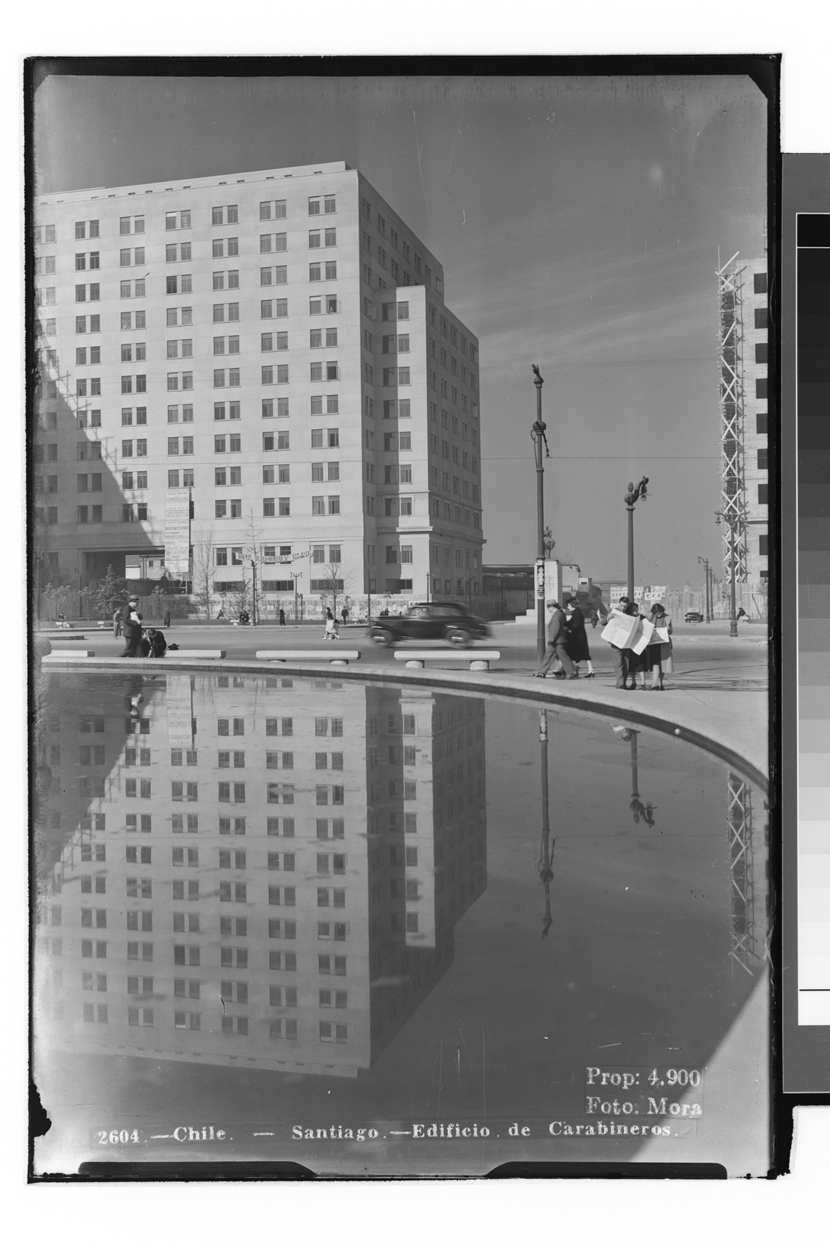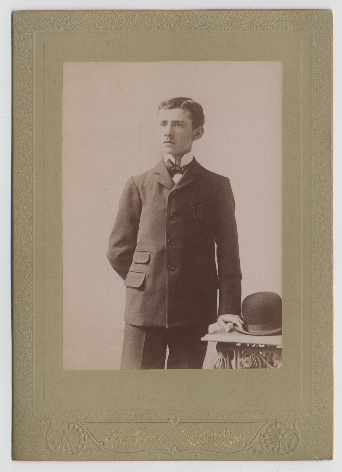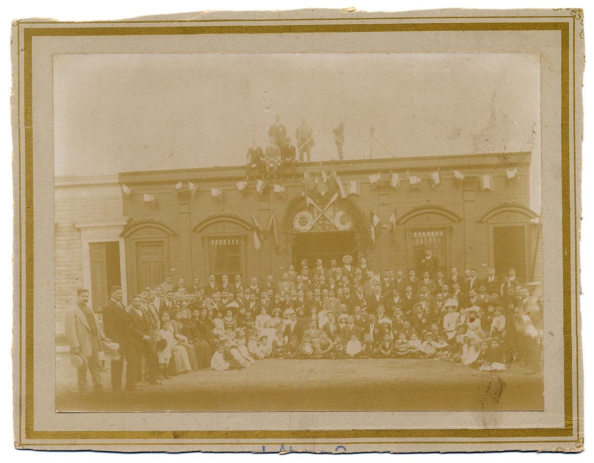Se muestra retrato de grupo compuesto por seis hombres, todos vestidos de una forma similar. Alrededor de ellos hay nieve y un pino a la izquierda.