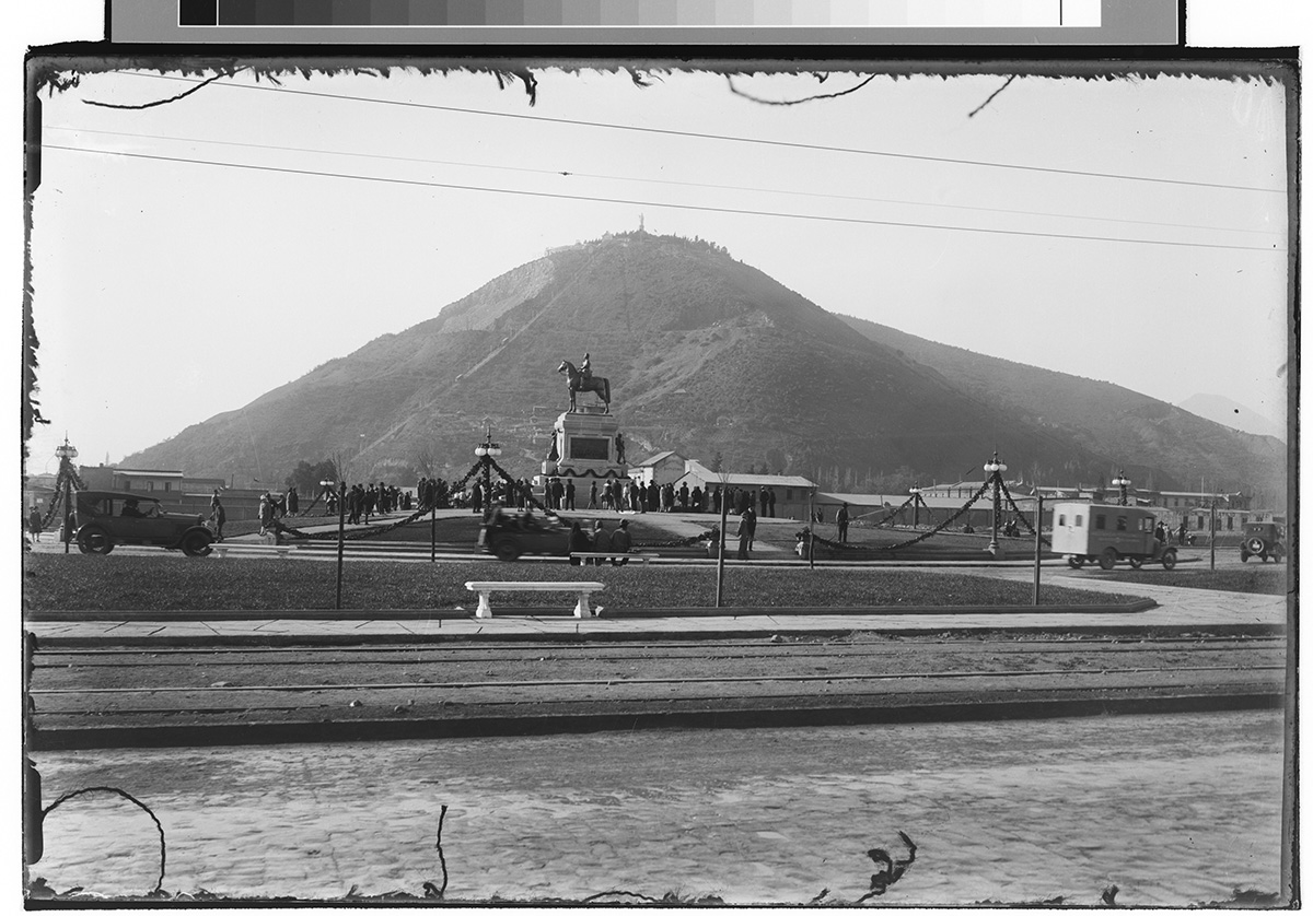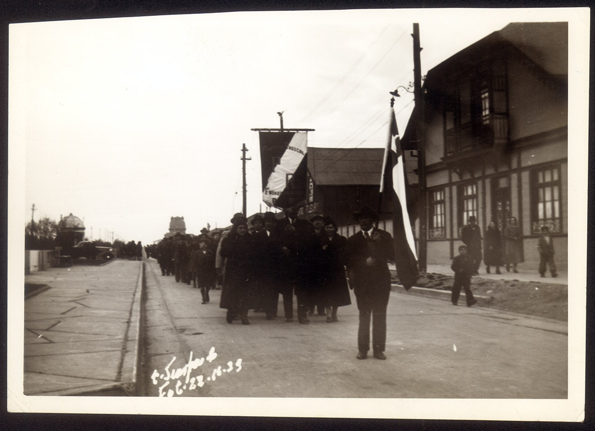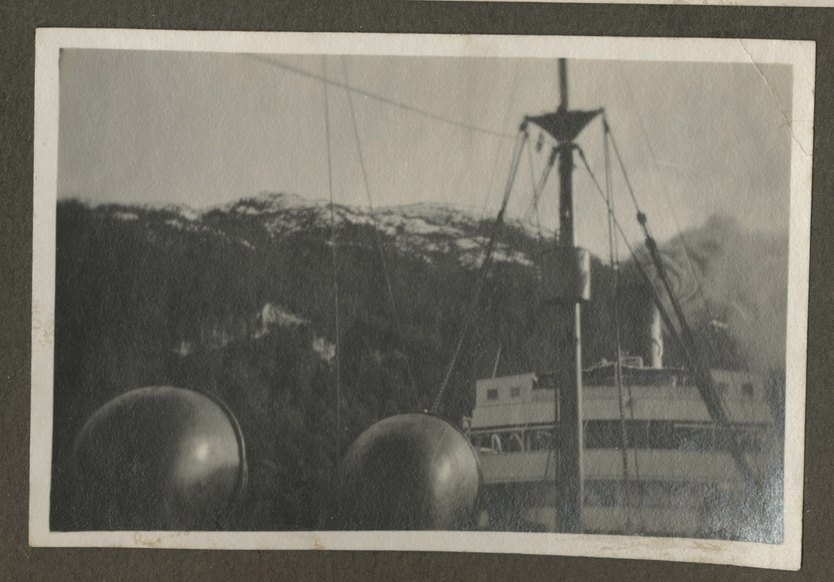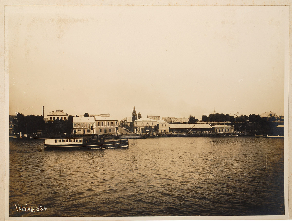 Vista de una ciudad a orillas de un río o de un lago. Un bote está pasando.
