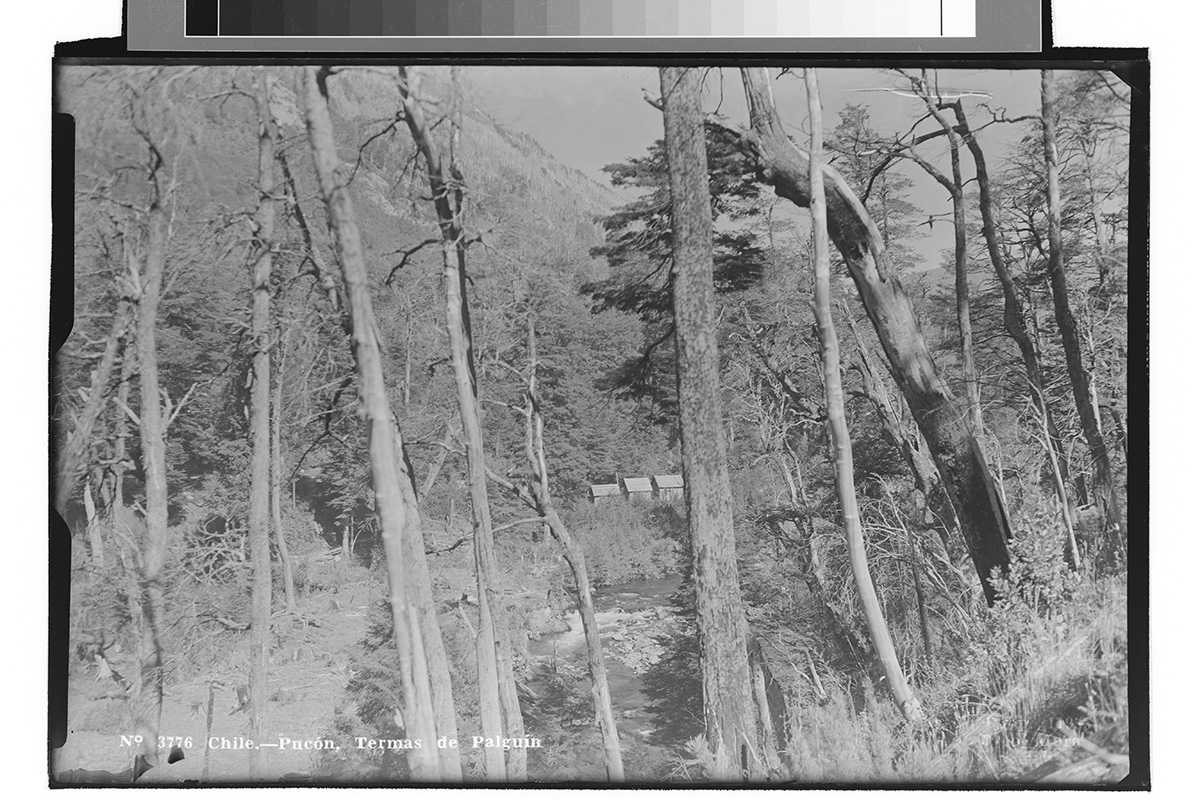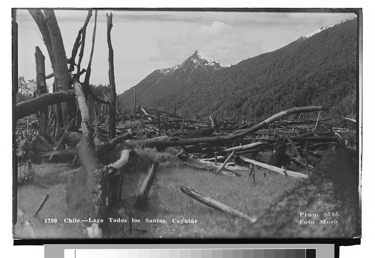 Se muestra vista hacia la orilla de un lago, su playa, algunas embarcaciones, un largo bosque por toda la orilla y al fondo se ven montañas.