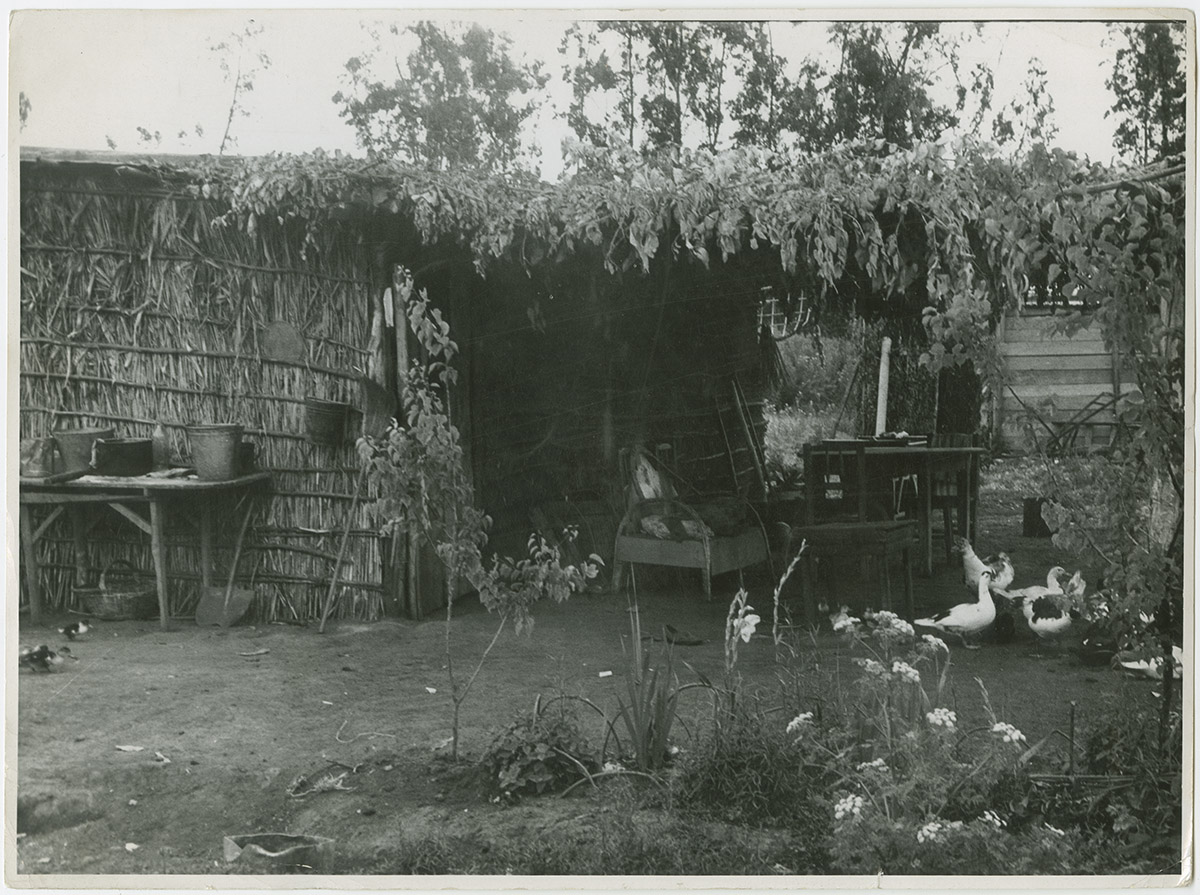Vista del patio de una casa con una mesa, utensilios, vegetación y gansos caminando.