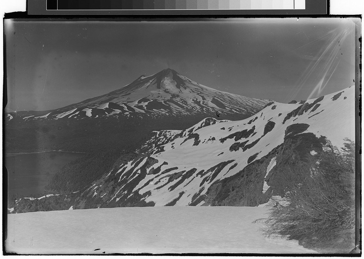 Vista desde una montaña con nieve hacia un volcán. En las faldas del volcán, varias hectáreas de bosque que se encuentra con un lago.