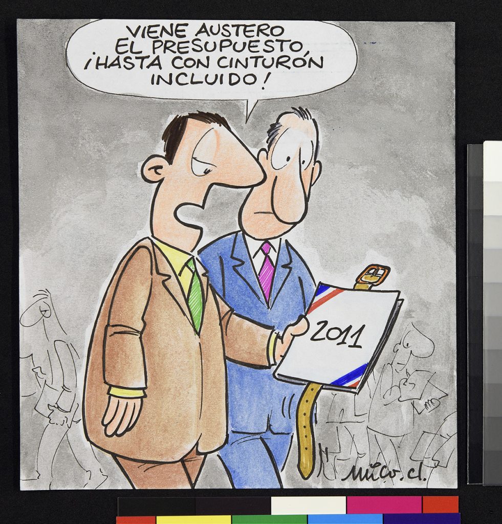 Dibujo de dos hombres que caminan juntos mientras miran una carpeta con un cinturón en su interior.