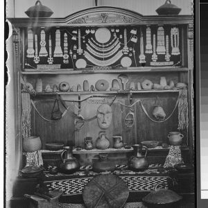 Mueble de madera con vitrinas, arriba dos ollas, abajo tras el vidrio joyas variadas mapuches. En el resto del mueble, piedras, jarrones, tejidos, una máscara y al centro abajo un kultrún.