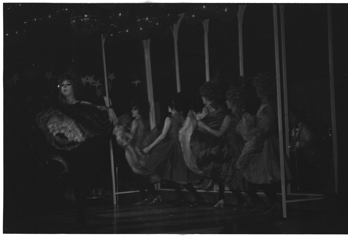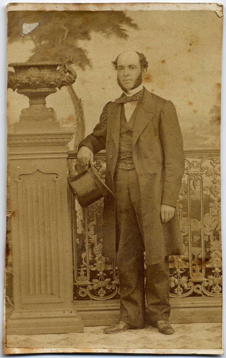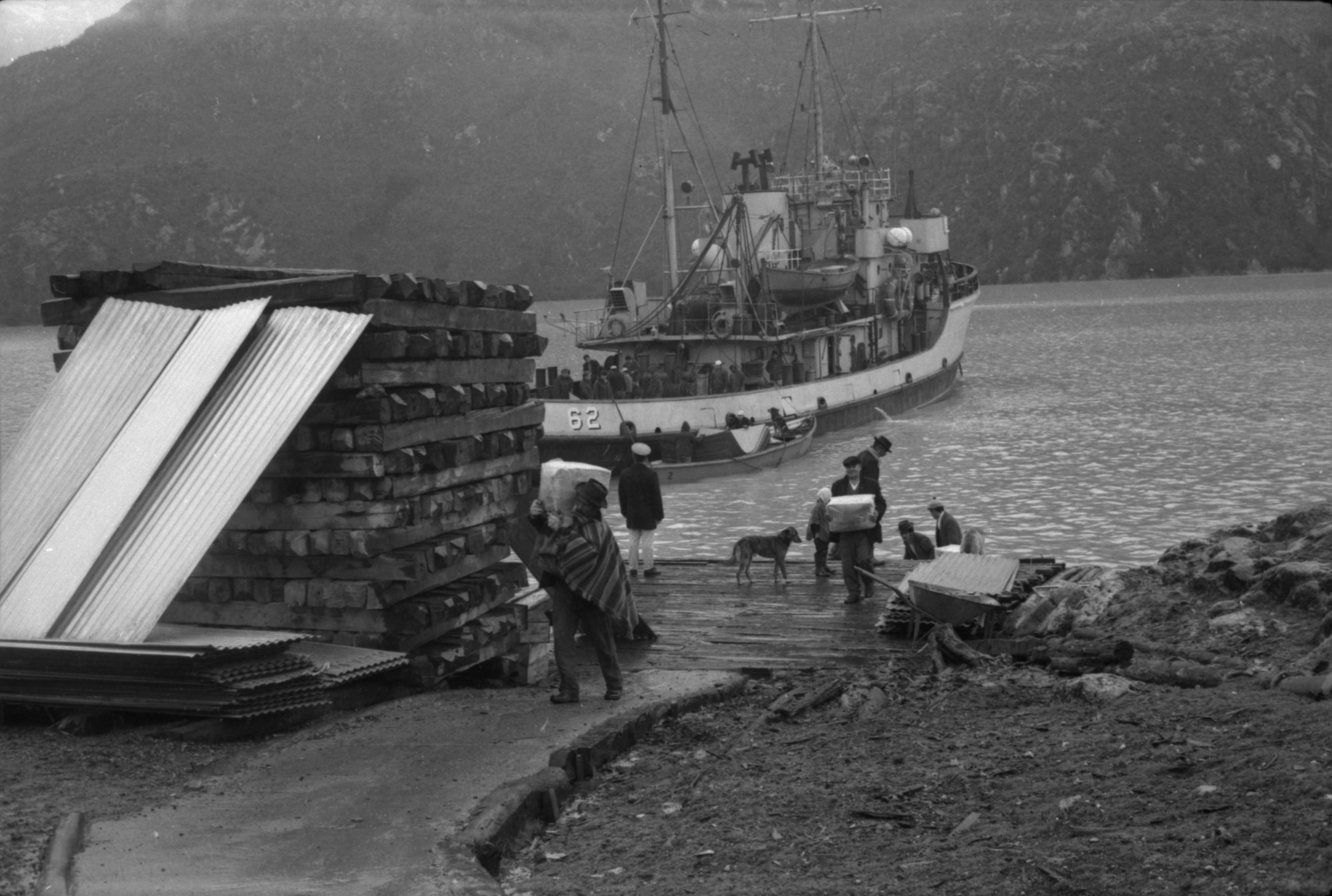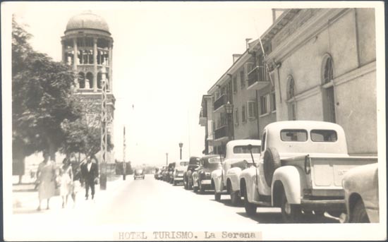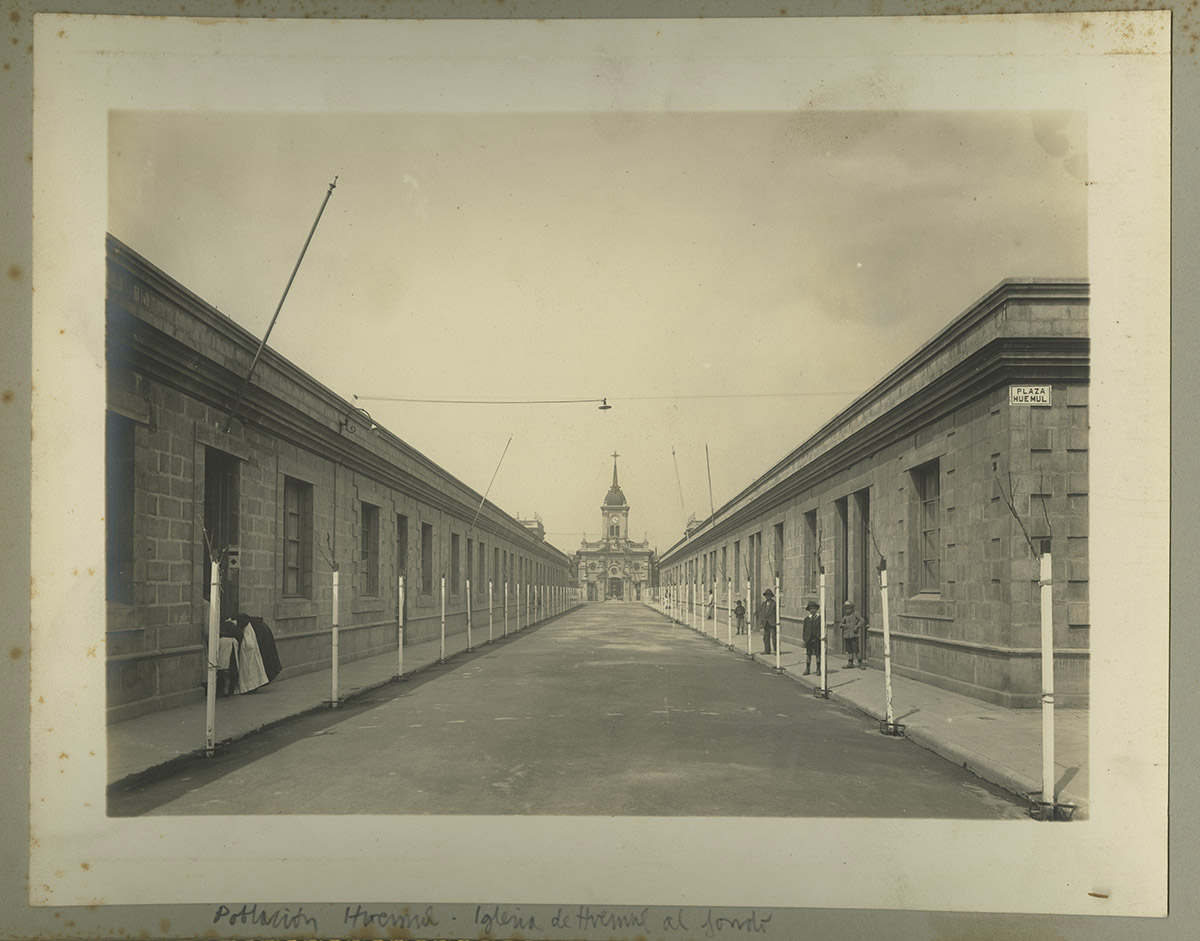 Vista de un edificio de dos pisos de tipo neoclásico. Sentada sobre la vereda se ve una mujer con hombres parados detrás de ella.