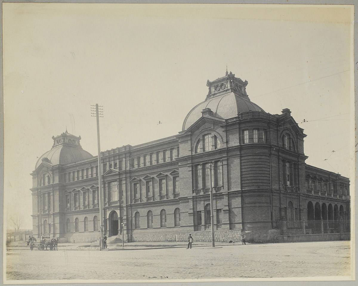 En un primer plano, varios Árboles de tronco delgado. De fondo, varias construcciones de diferente tamaño sobre la ladera de un cerro rodeado de bosques.