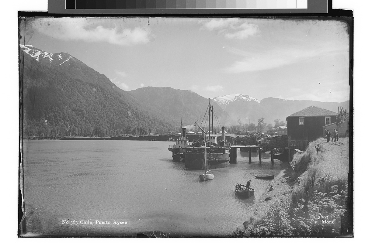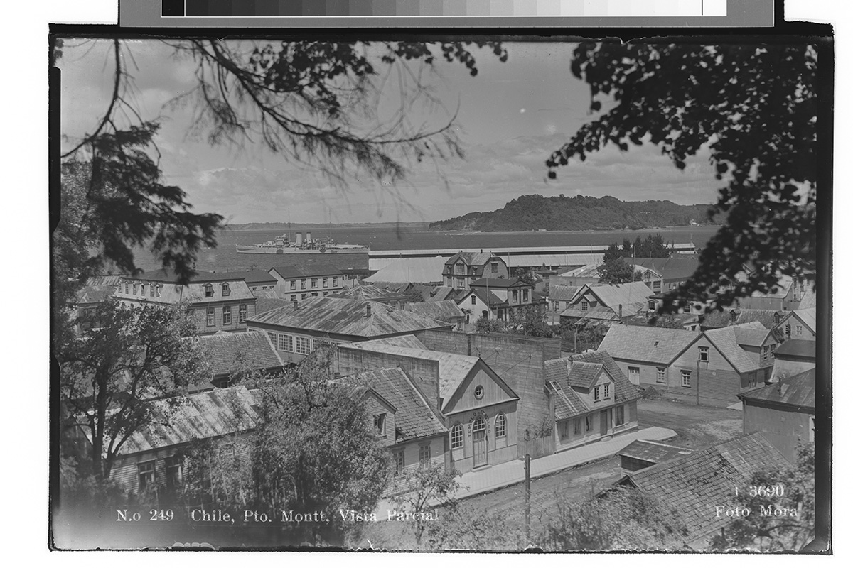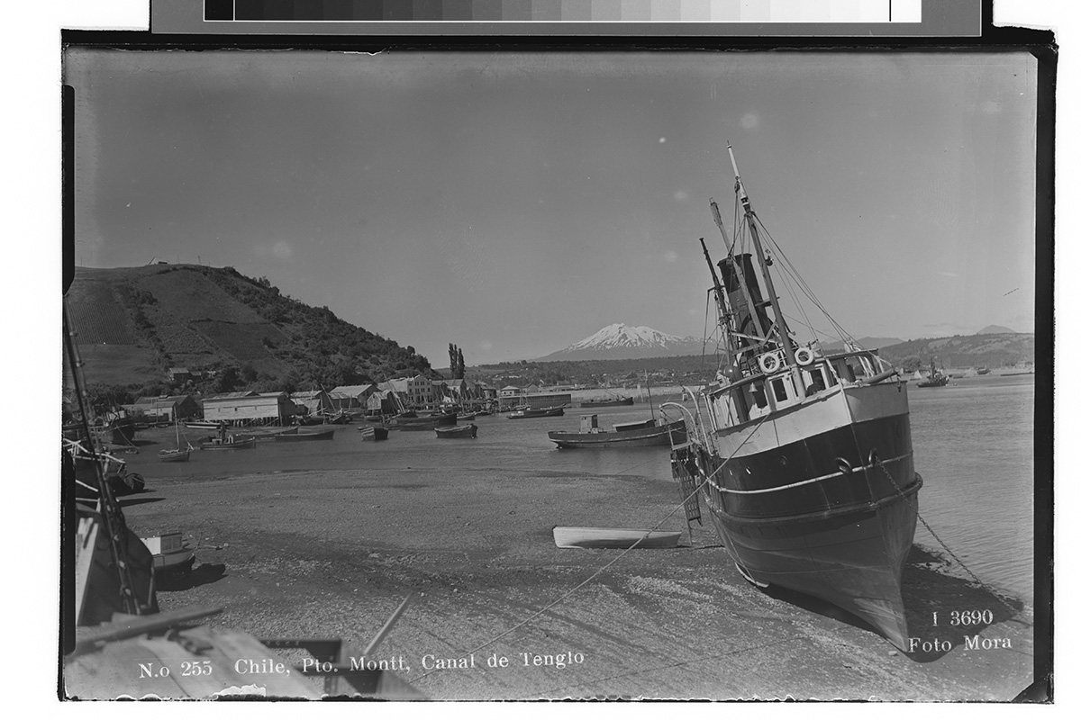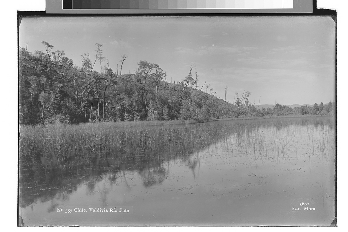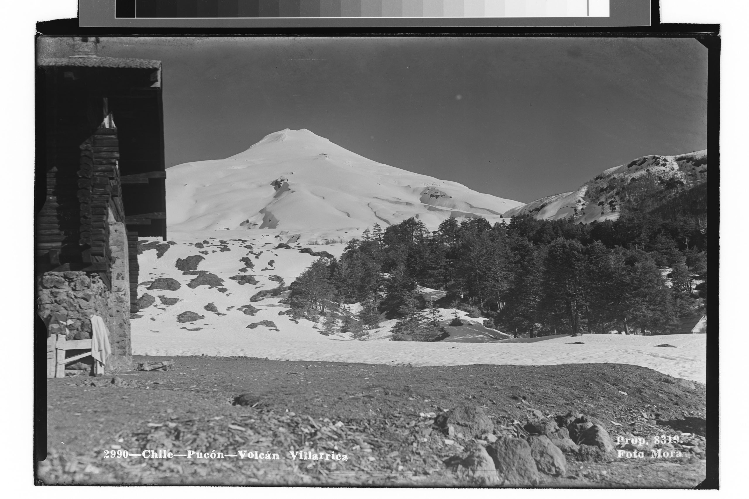Vista desde una montaña con nieve hacia un volcán. En las faldas del volcán, varias hectáreas de bosque que se encuentra con un lago.