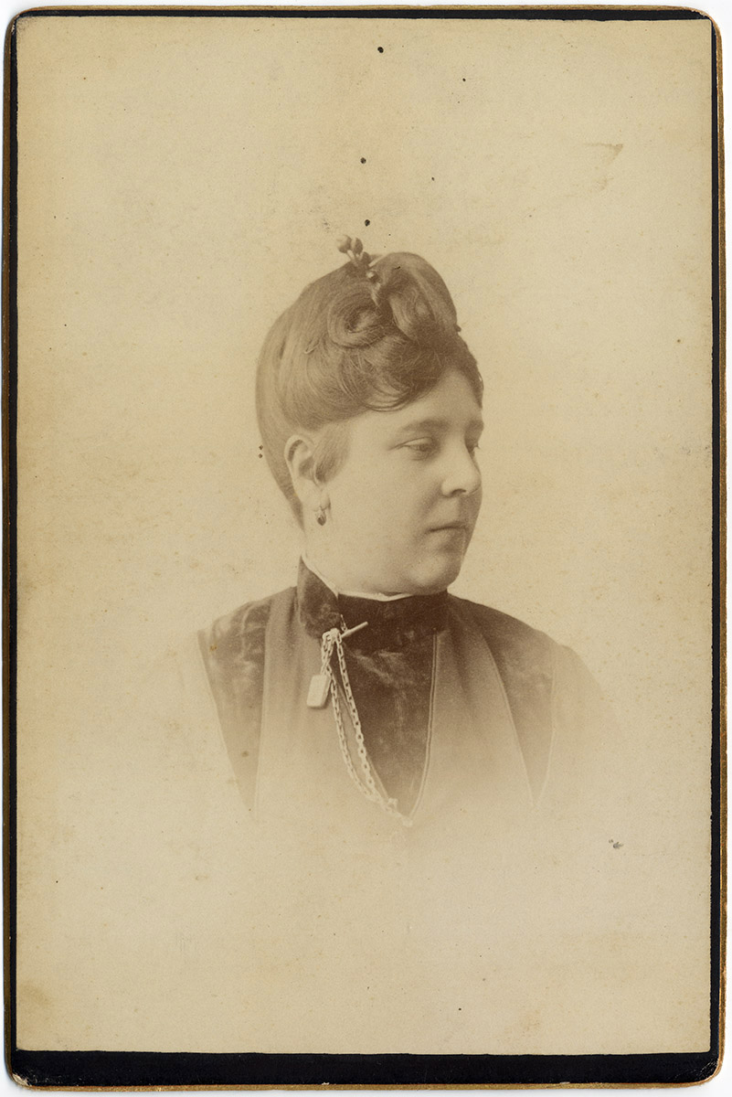 Retrato en primer plano de una mujer de perfil con pelo tomado en moño y vestido blanco.