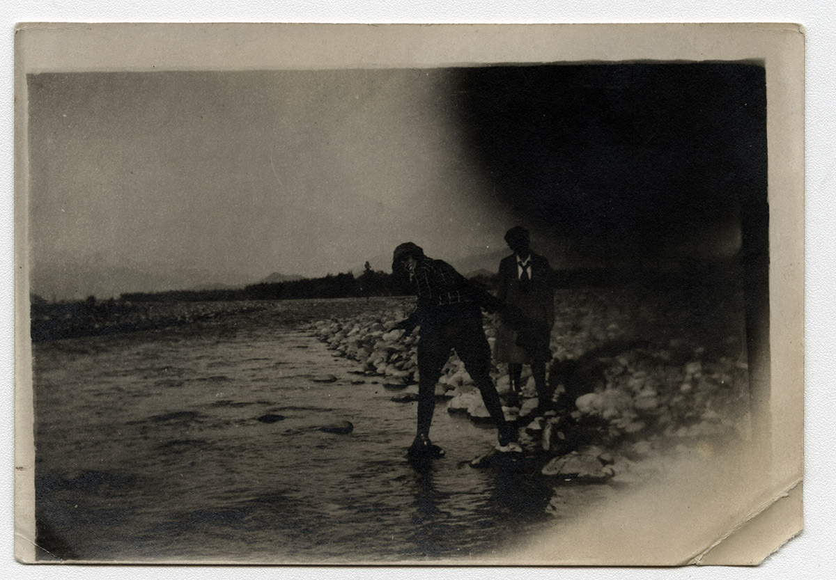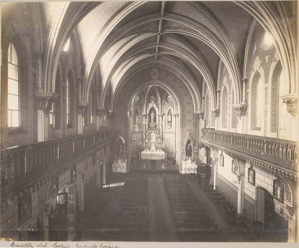 Retrato de un niño con pelo raso y terno tres piezas. Se encuentra de pie al lado de una mesa con su brazo apoyado sobre un libro abierto. Atrás de él se ve una silla.
