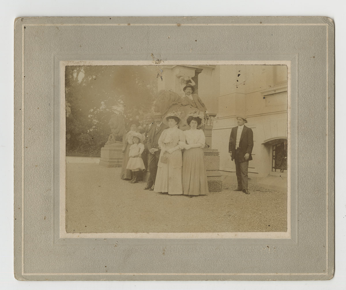 Se muestra un grupo de cinco personas, compuesto por dos mujeres y tres hombres. Cada uno de ellos está montando un caballo y mirando hacia la misma dirección. El paisaje que los rodea vegetación escasa o nula .