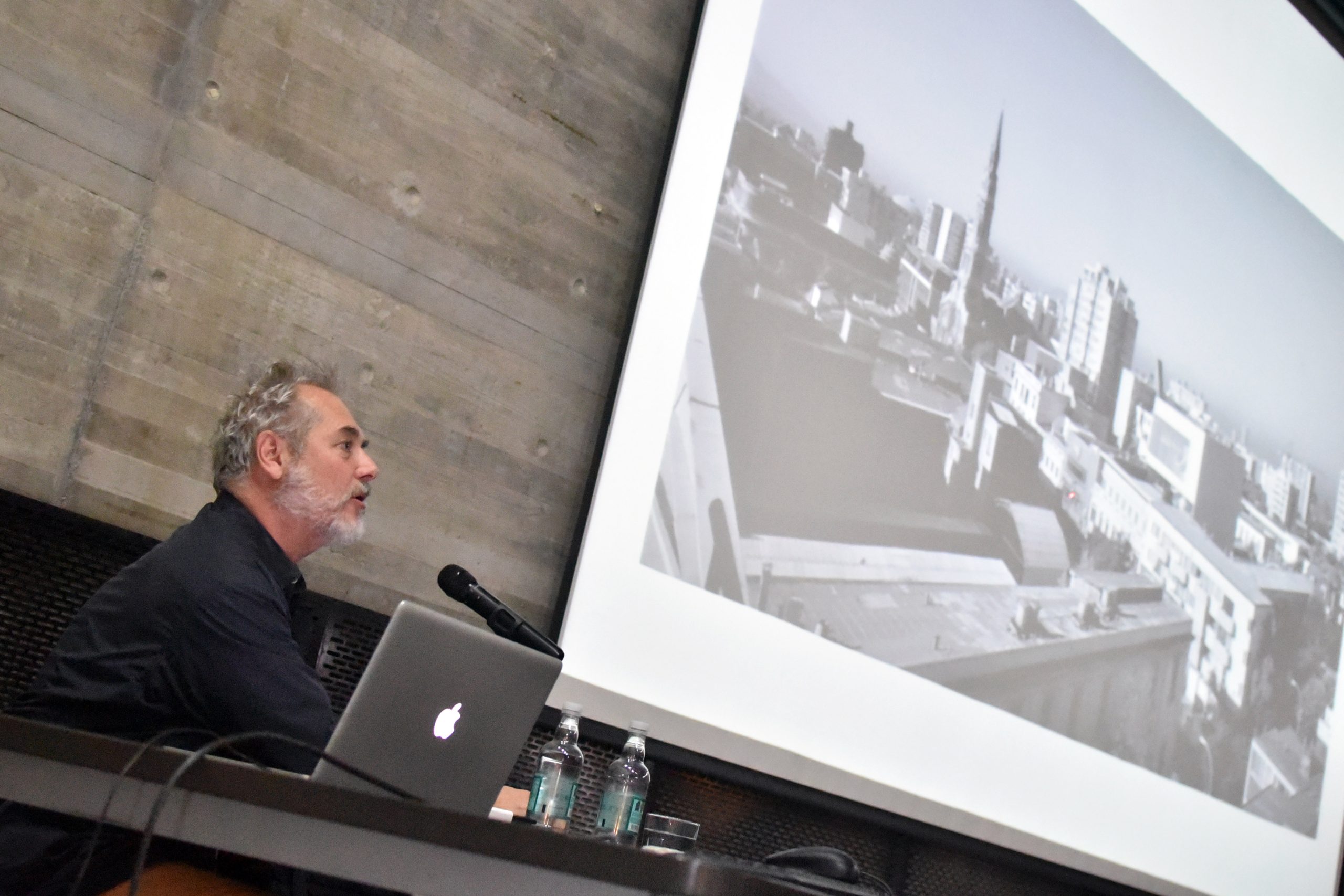 Estatua de Cristo clavado en la cruz y a sus pies la virgen María y María Magdalena.