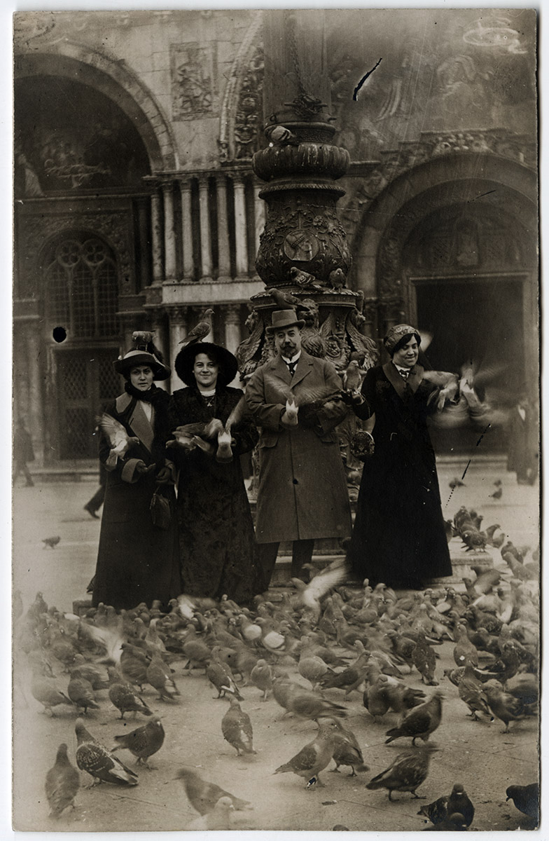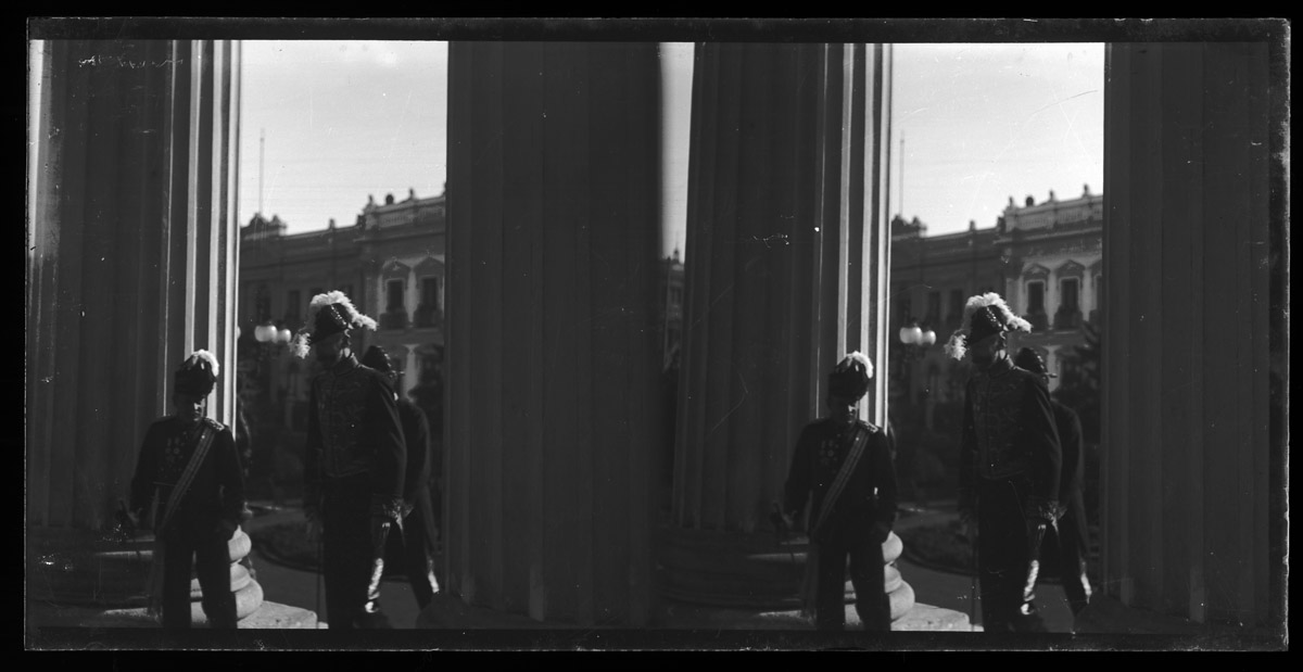 Montaña a los pies de la cual se ven tres hombres a caballo.