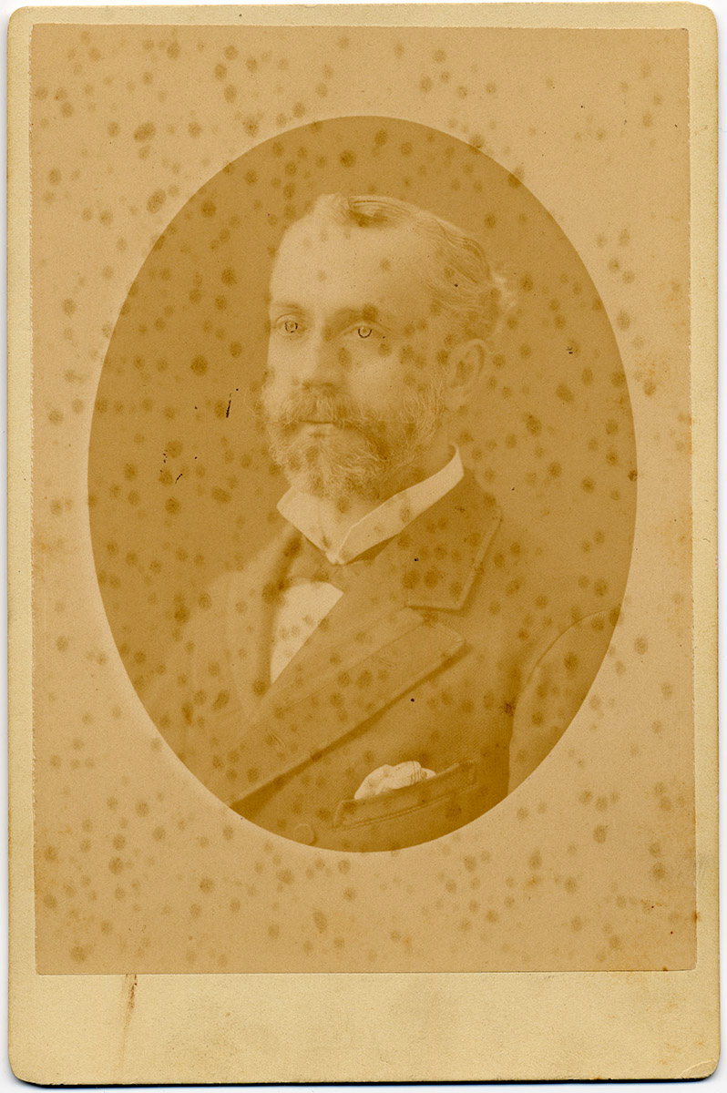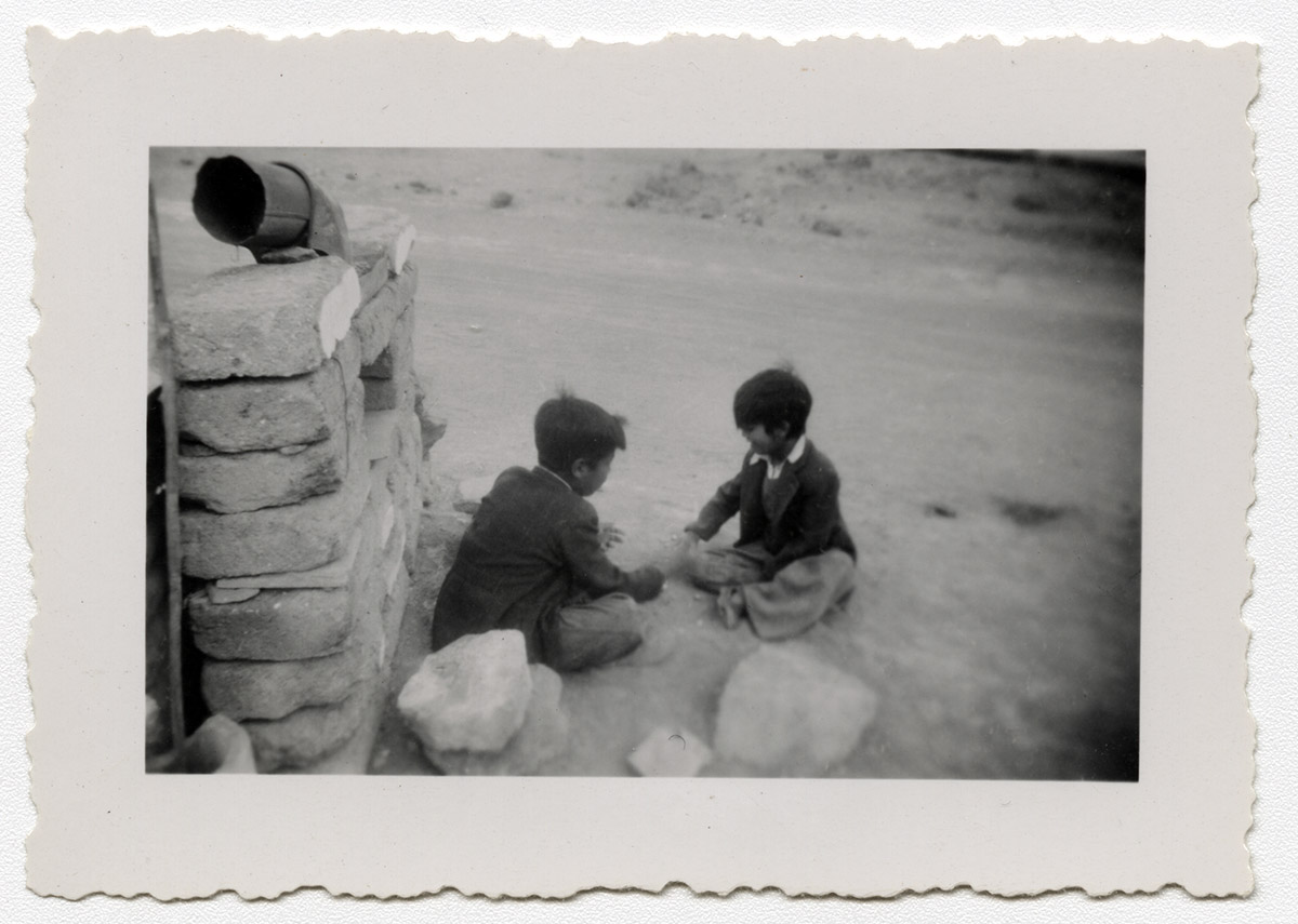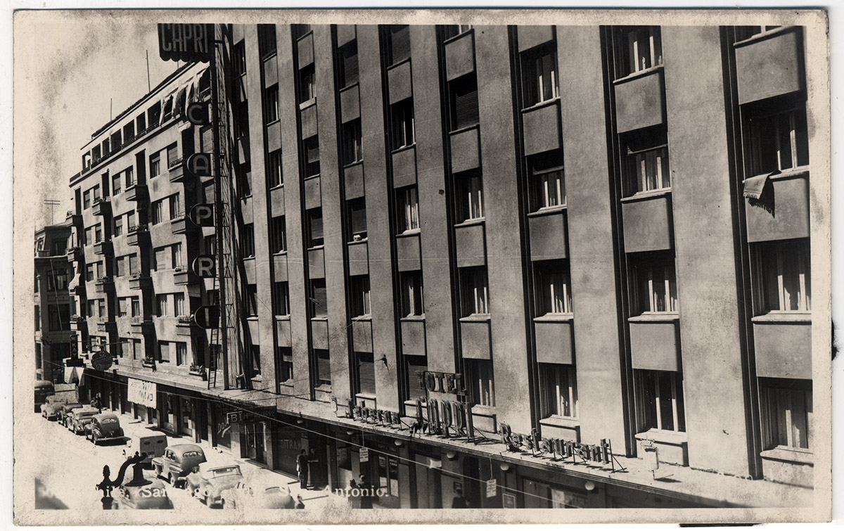 Vista de varias construcciones de madera que son parte de una ciudad. En la parte inferior de la fotografía se puede distinguir parte de una plaza, donde se encuentra una esquina donde termina una calle y la otra continua. Varios transeúntes caminan por las veredas.