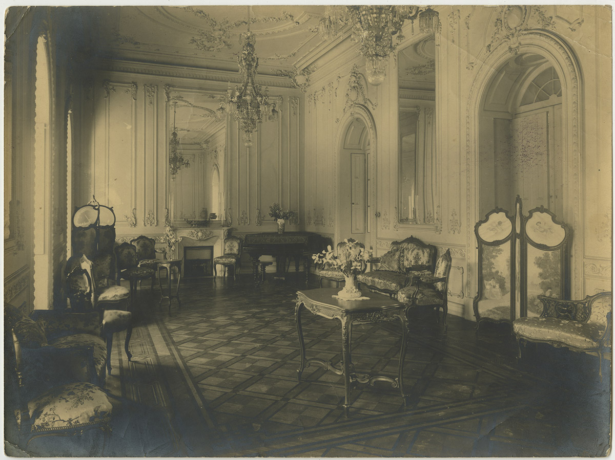Al costado izquierdo de la fotografía, parte de las ramas de un árbol. Al costado derecho una muralla de una casa de madera. De fondo, espacios amplios con vegetación que terminan con un volcán con nieve.