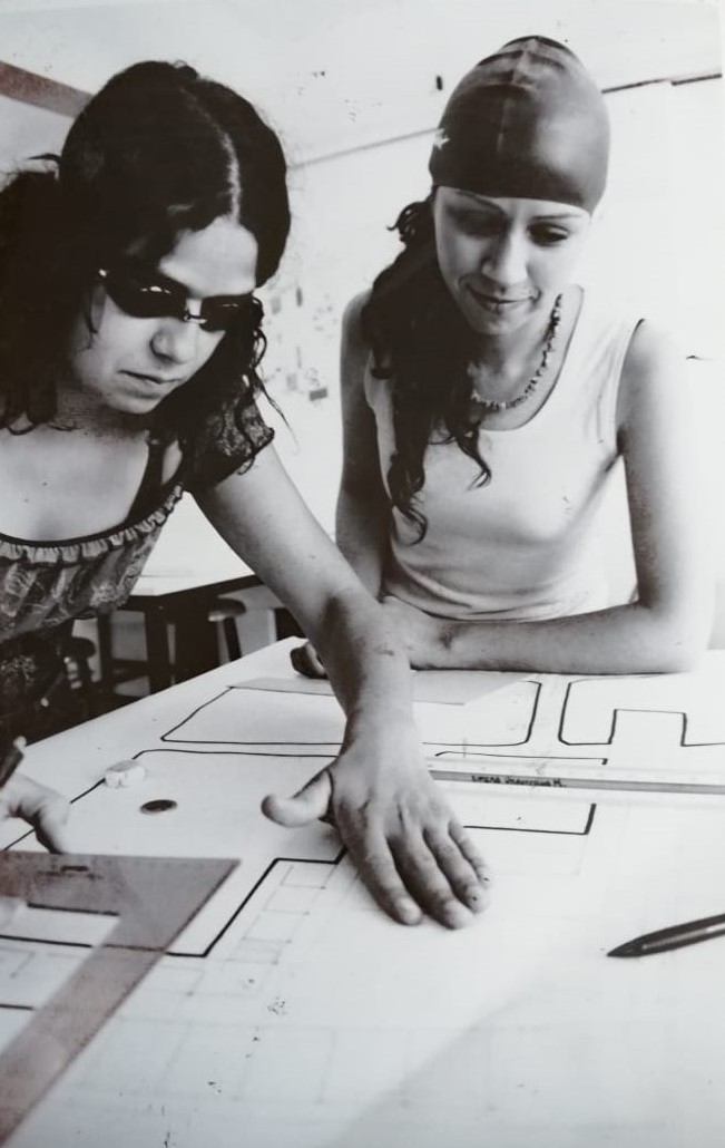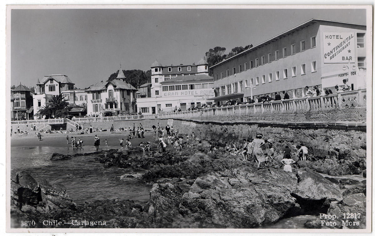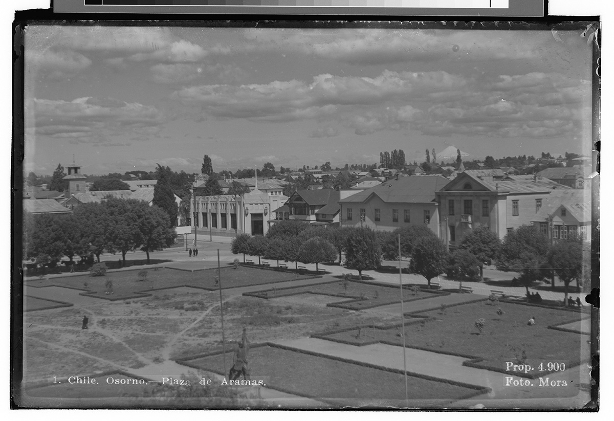 Vista dos construcciones de madera , una bicicleta detenida en una de las entradas, dos hombres de traje de pie en la calle de tierra entre las dos casas. De fondo el lago rodeado de montañas con las cimas nevadas.