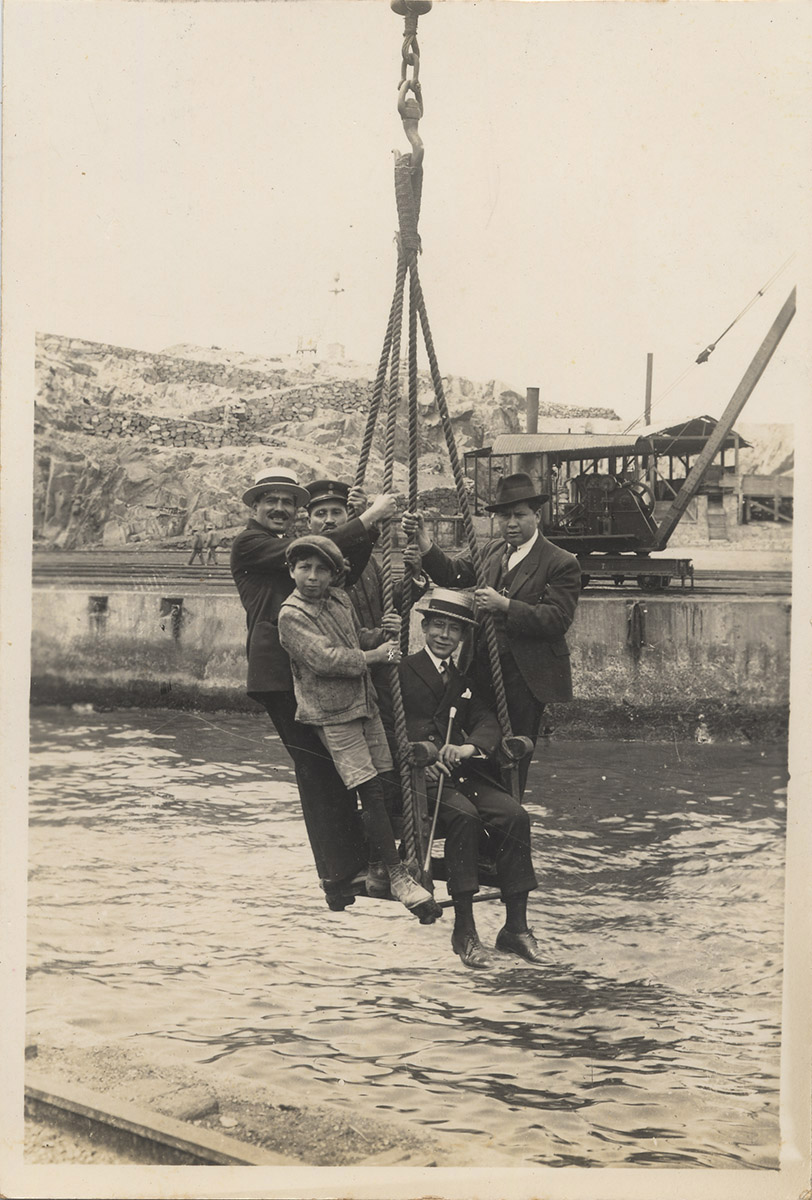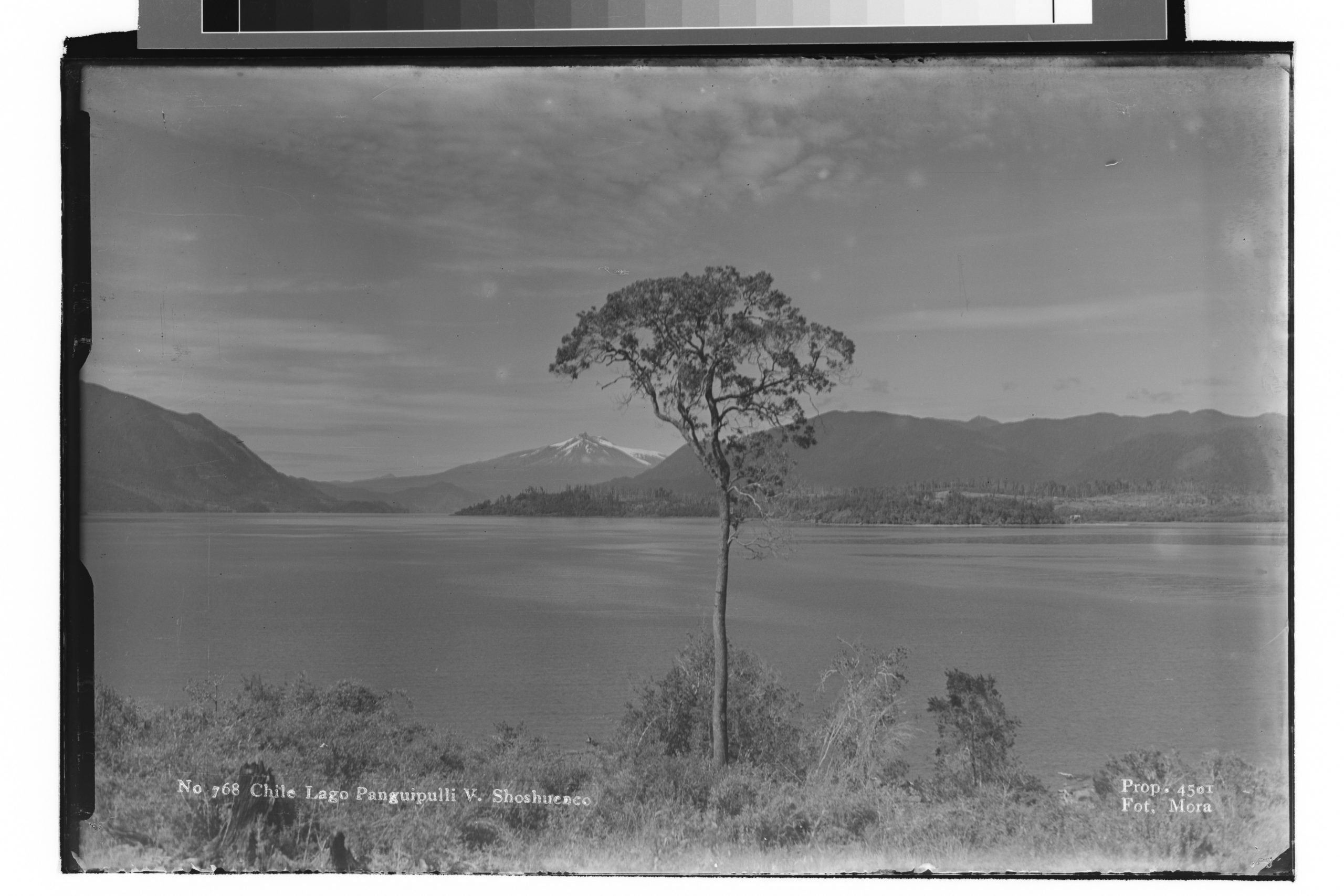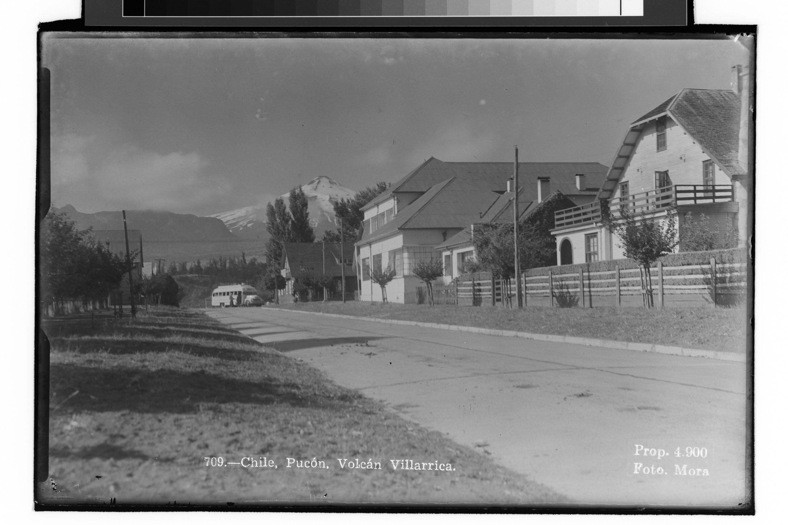 Un amplio camino de tierra donde circula una carreta. A su costado se ven algunas construcciones rodeados de pinos.