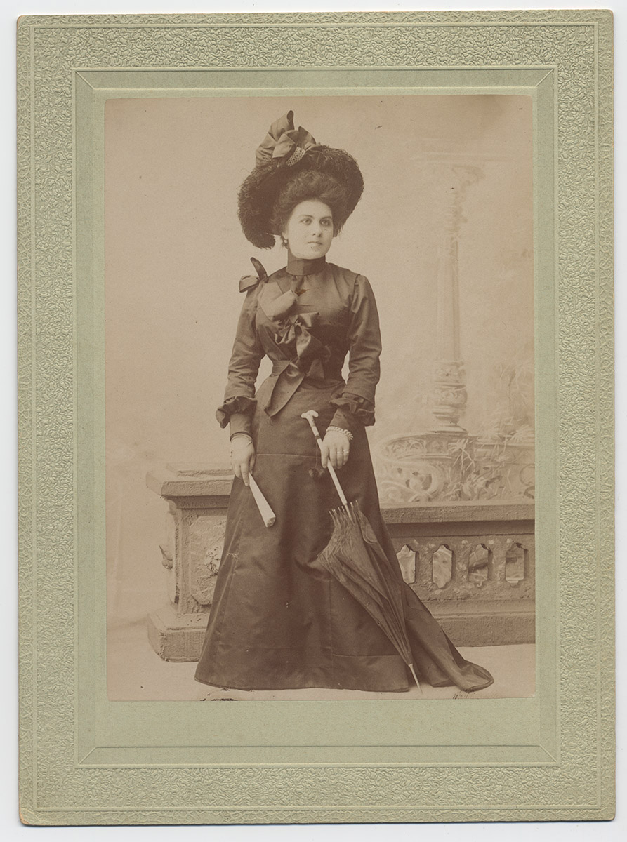 Retrato hombre de pie, barba larga desde el mentón, bigotes, contextura delgada. Sombrero, traje con rajaduras, tres ojales y un solo botón, pantalón corto, pies descalzos. Pequeña bolsa de género en la mano, larga y delgada vara de madera en la misma mano. Fondo exterior, campo.