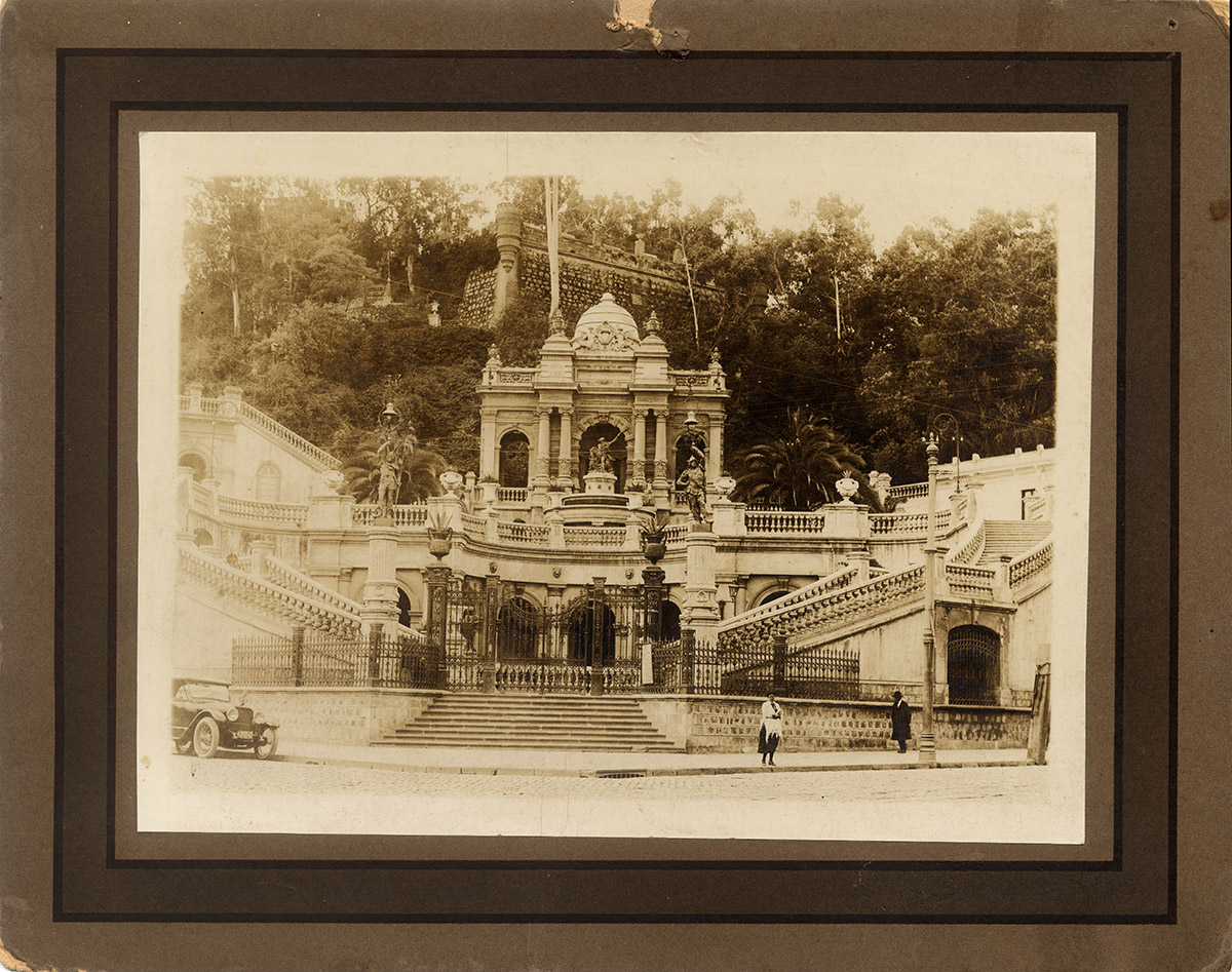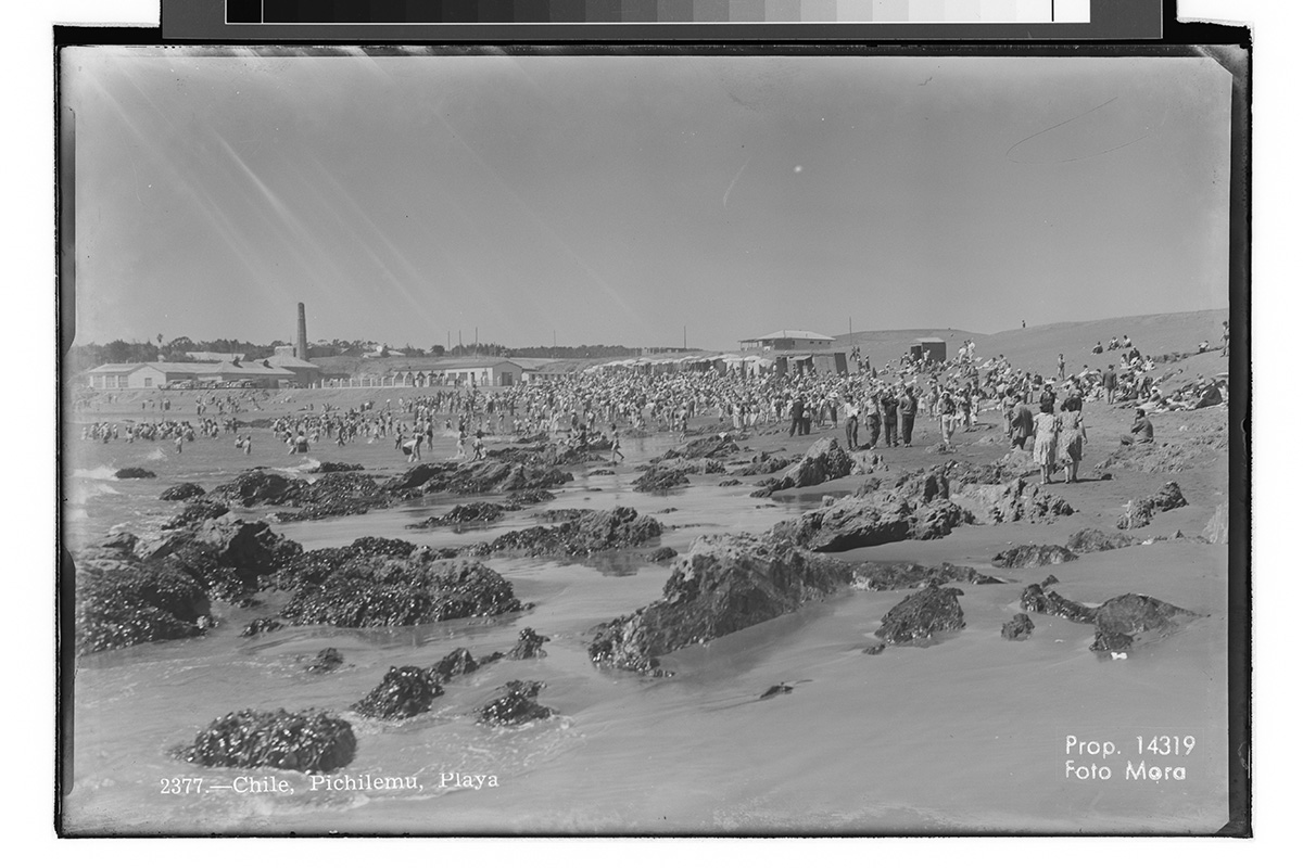 Vista playa entre medio de tres pilares tipo romanos.