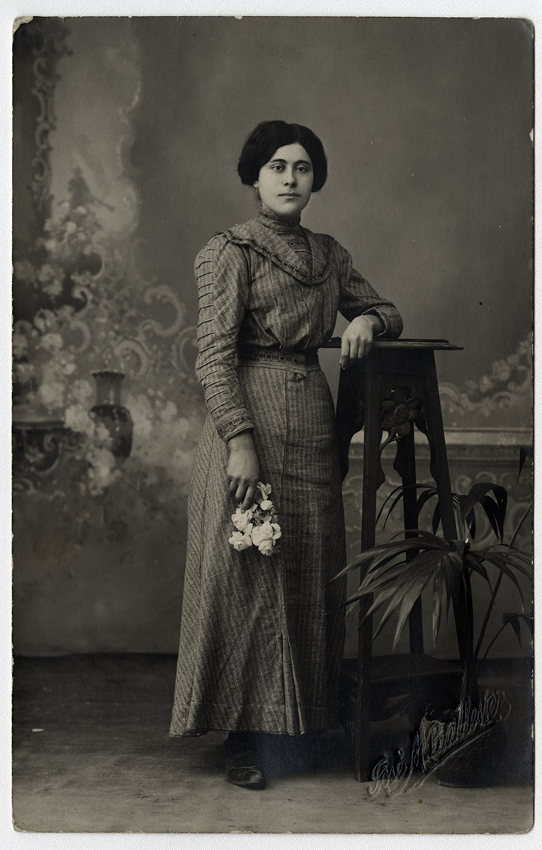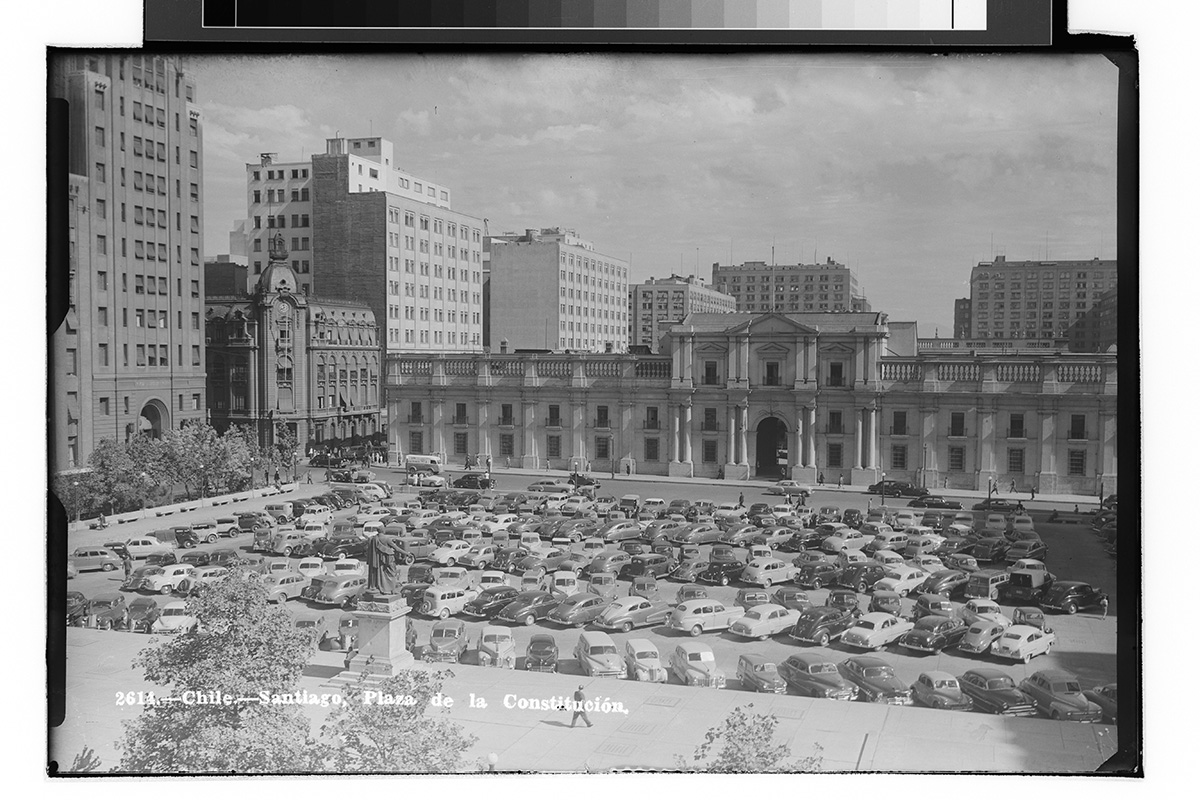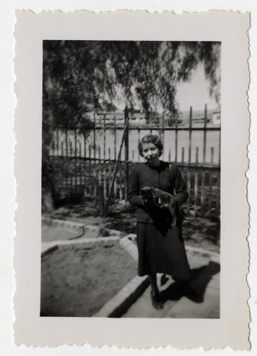 Grupo de dos mujeres sosteniendo una guagua, dos hombres con dos niños sentados sobre sillas en el patio de una casa. Uno de los hombres tiene un perro apoyado sobre su rodilla.