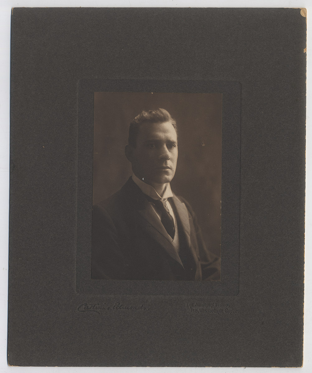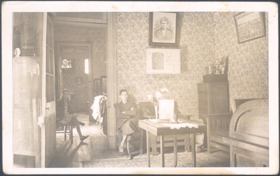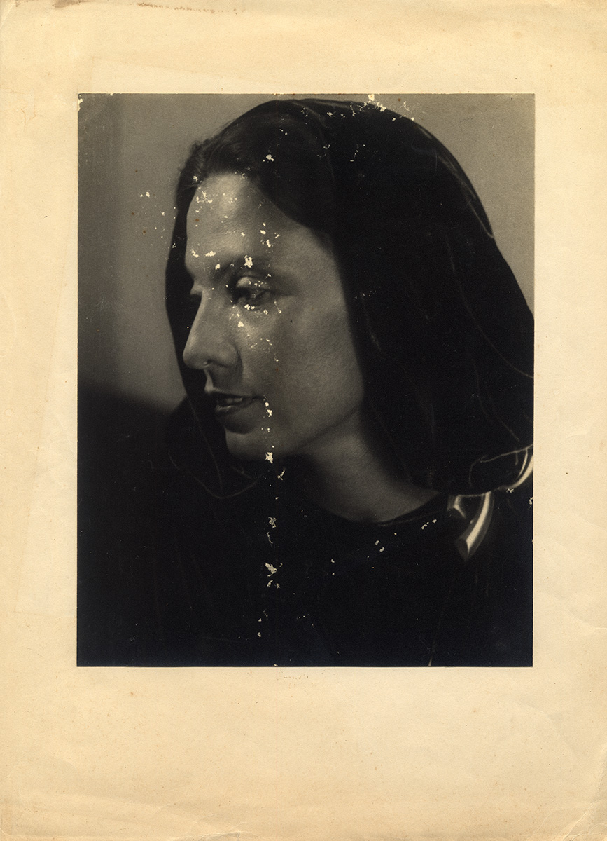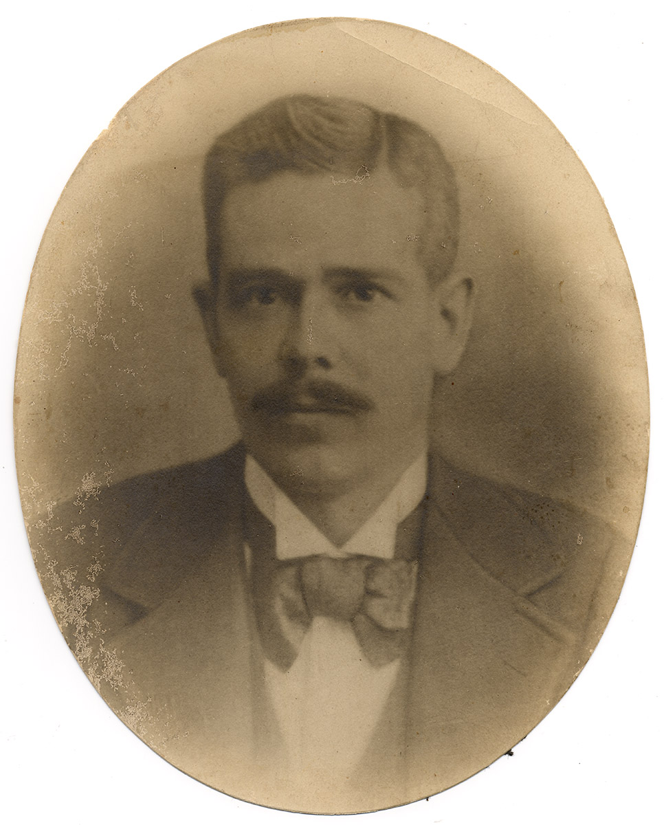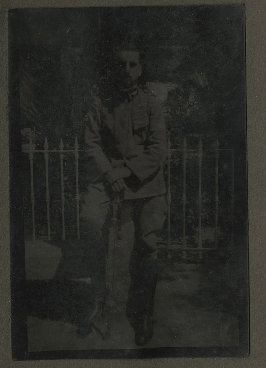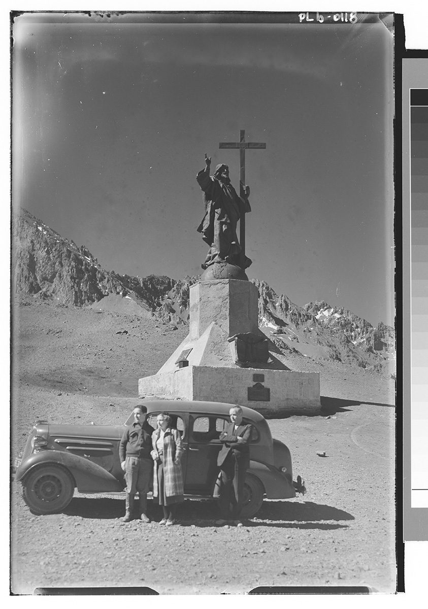 Paisaje de campo y montaña. En primer plano, en la esquina derecha inferior de la foto, se ven dos hombres.