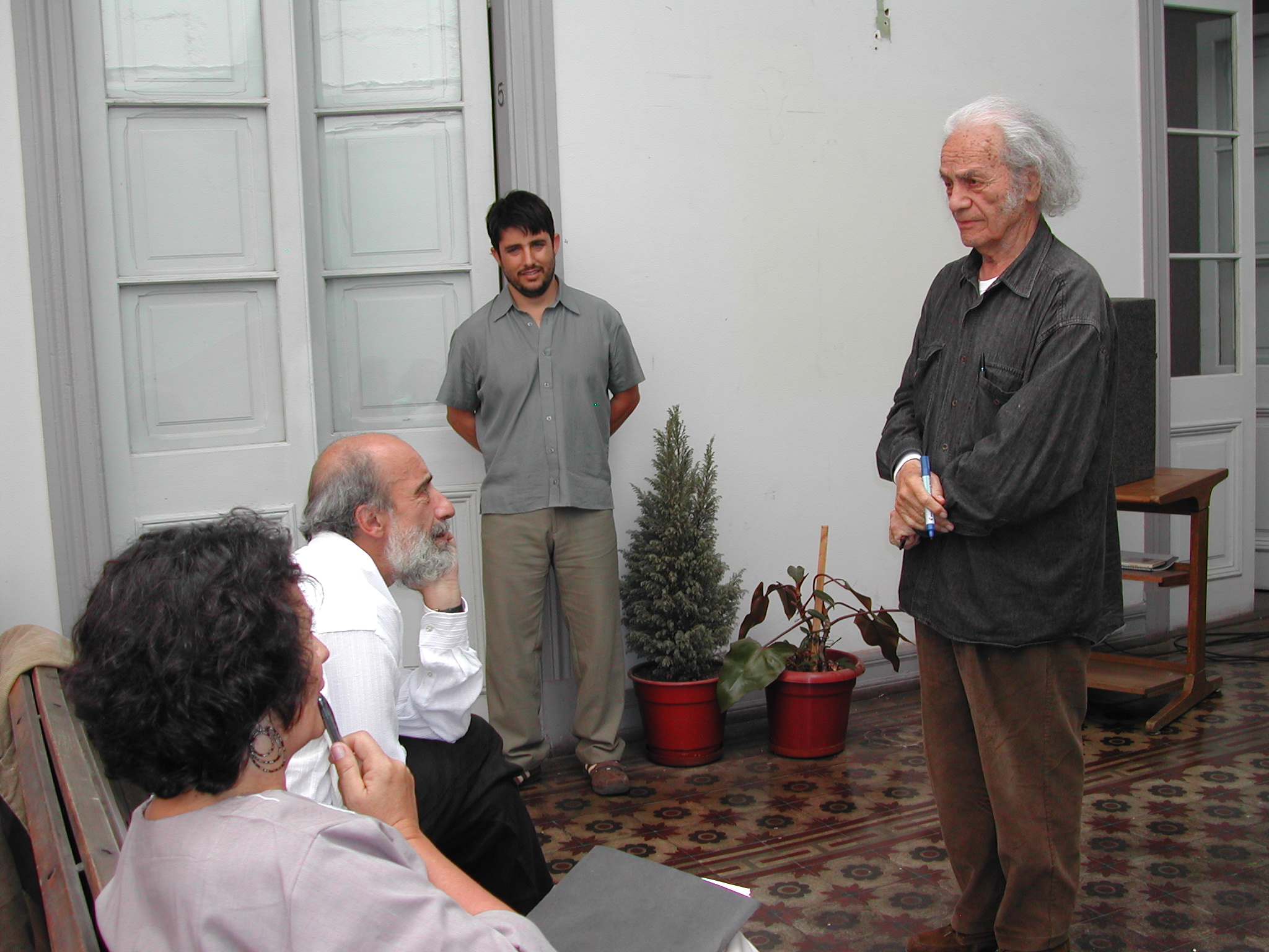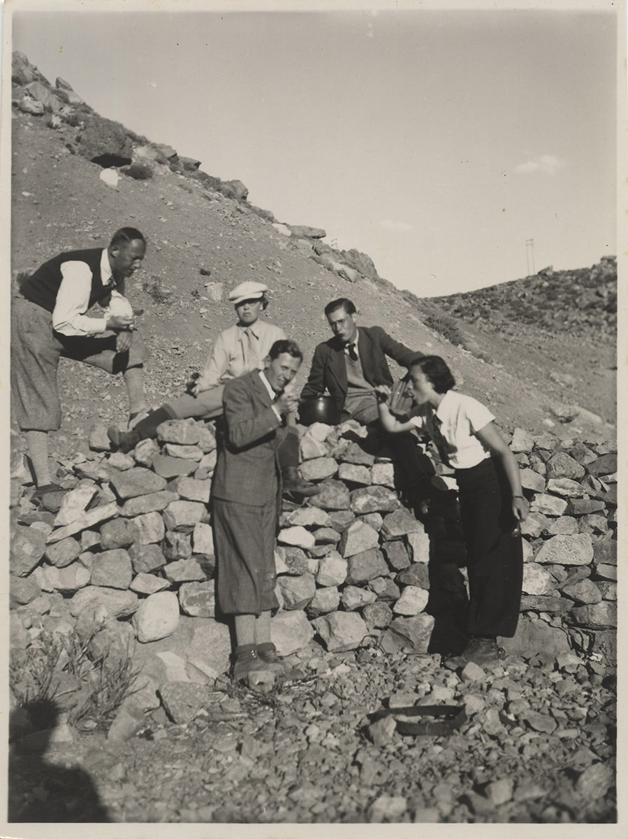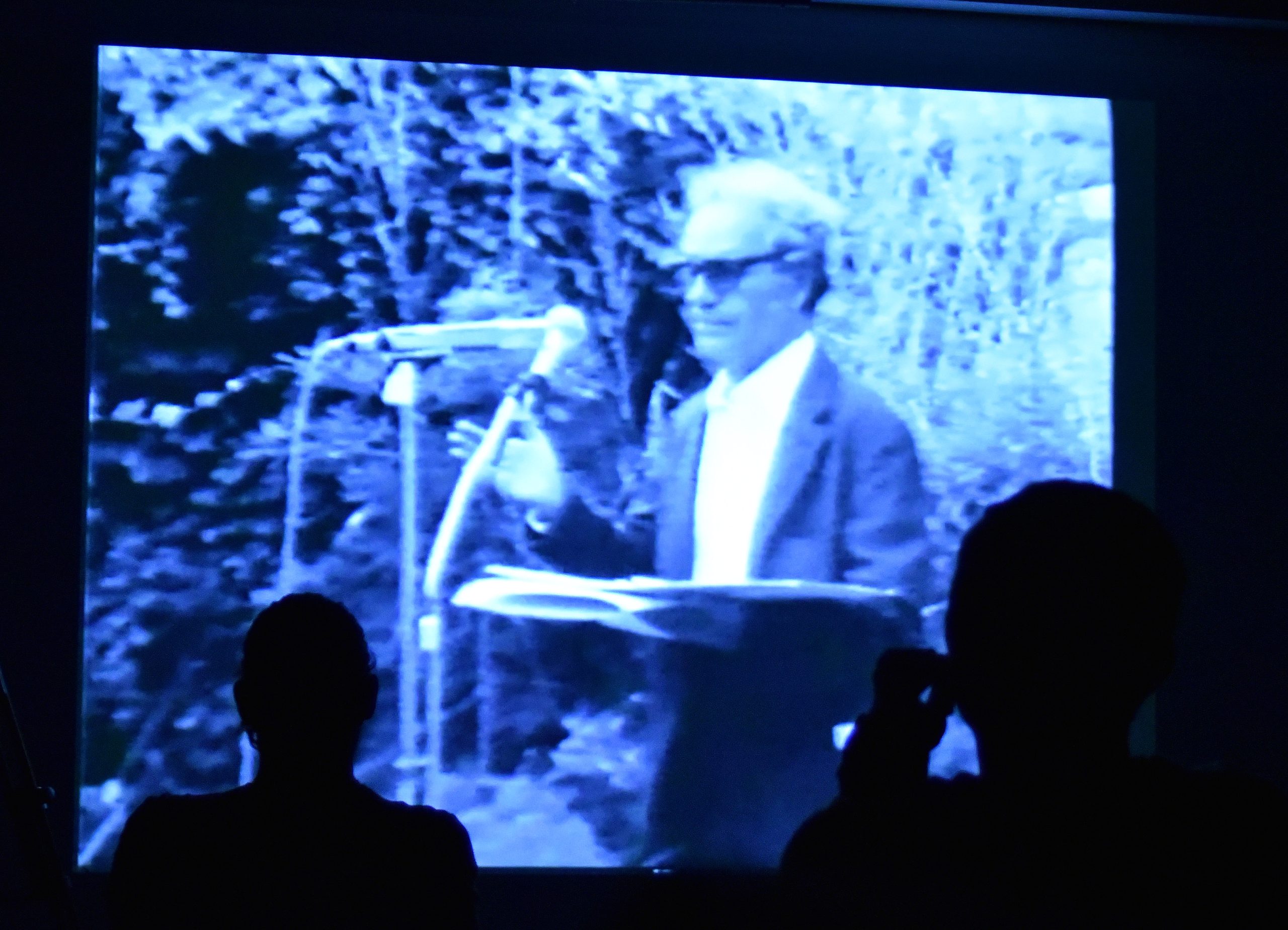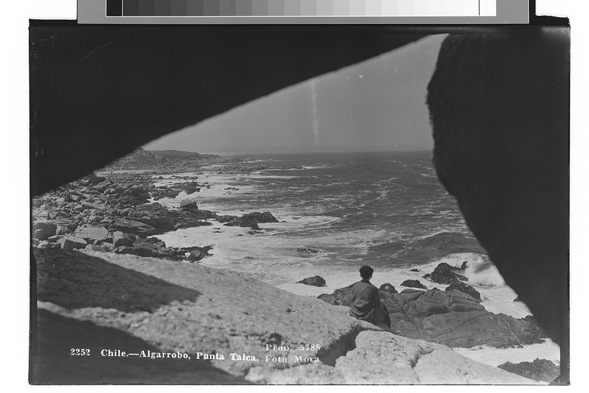 Al costado derecho de la fotografía una construcción de madera en las orillas de un lago, junto a un barco que se encuentra encallado cerca de la construcción. De fondo, un volcán con su cima con nieve.