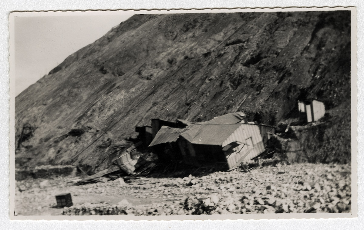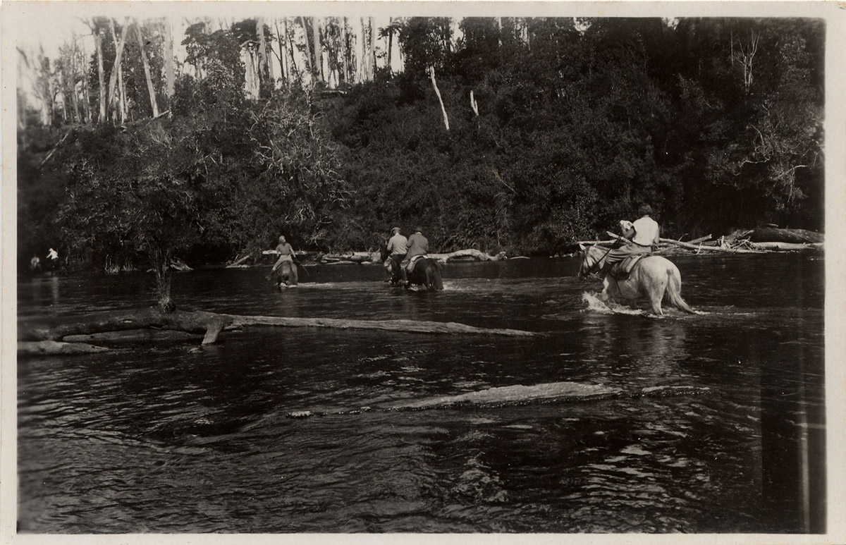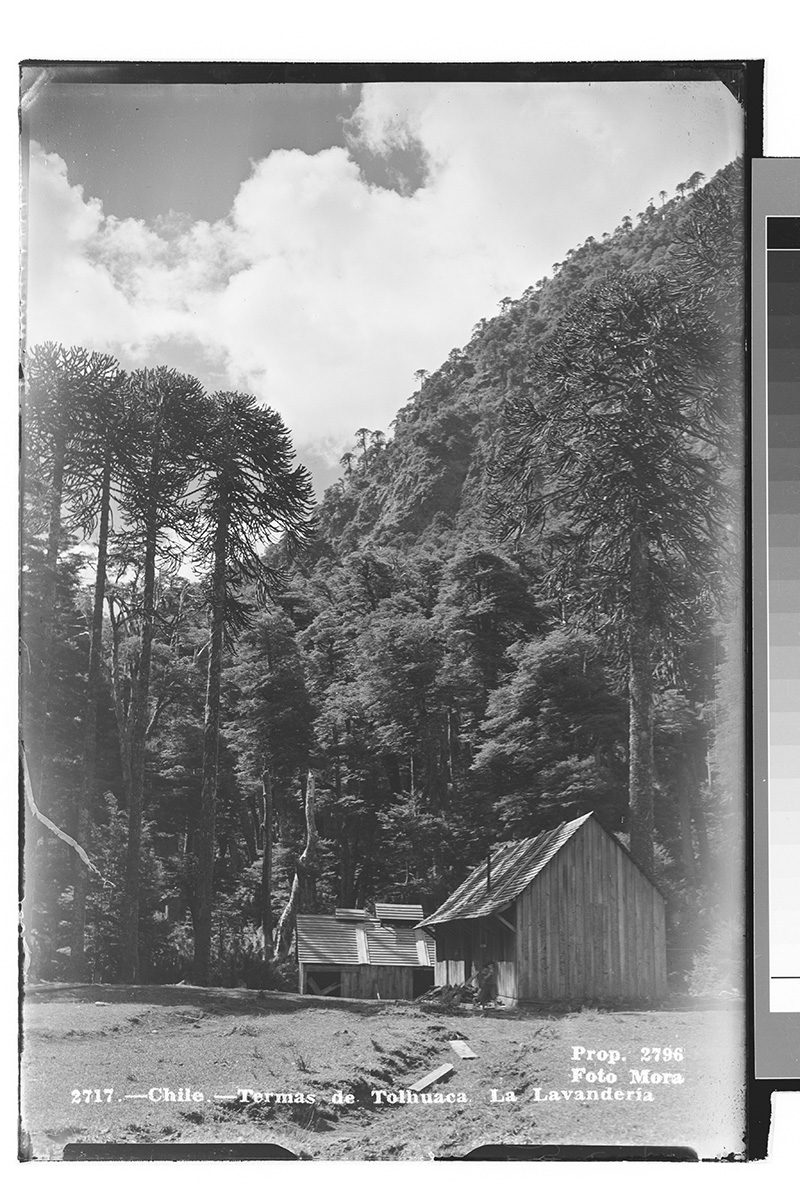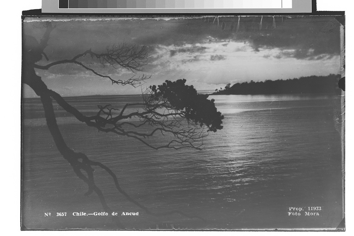 Vista desde la orilla de un lago, donde se ve un conjunto de piedras. Al fondo, parte de un cordón montañoso donde destaca un volcán con poca nieve.