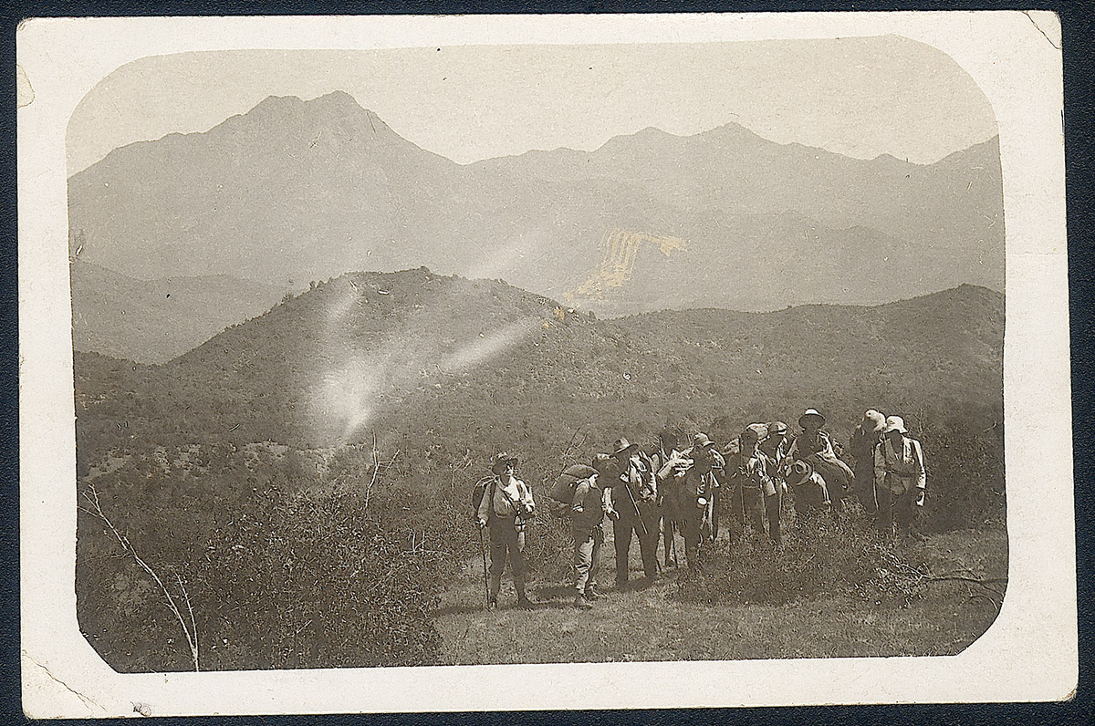 Hombre sentado sobre el borde de un bote mirando a sus dos perros en el agua.