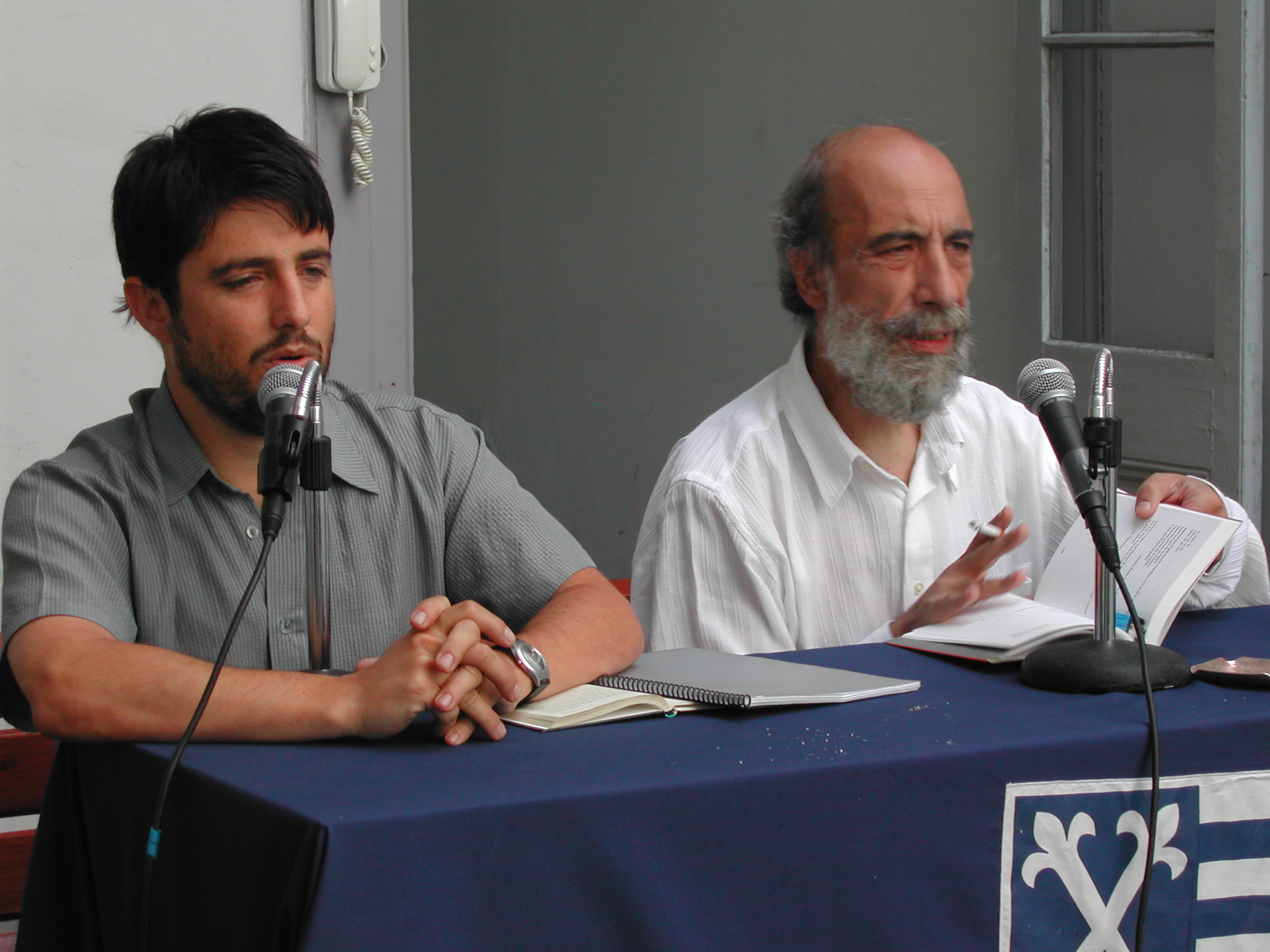 Dos militares parados a la entrada de una calle, al fondo un carro bomba y un bombero.